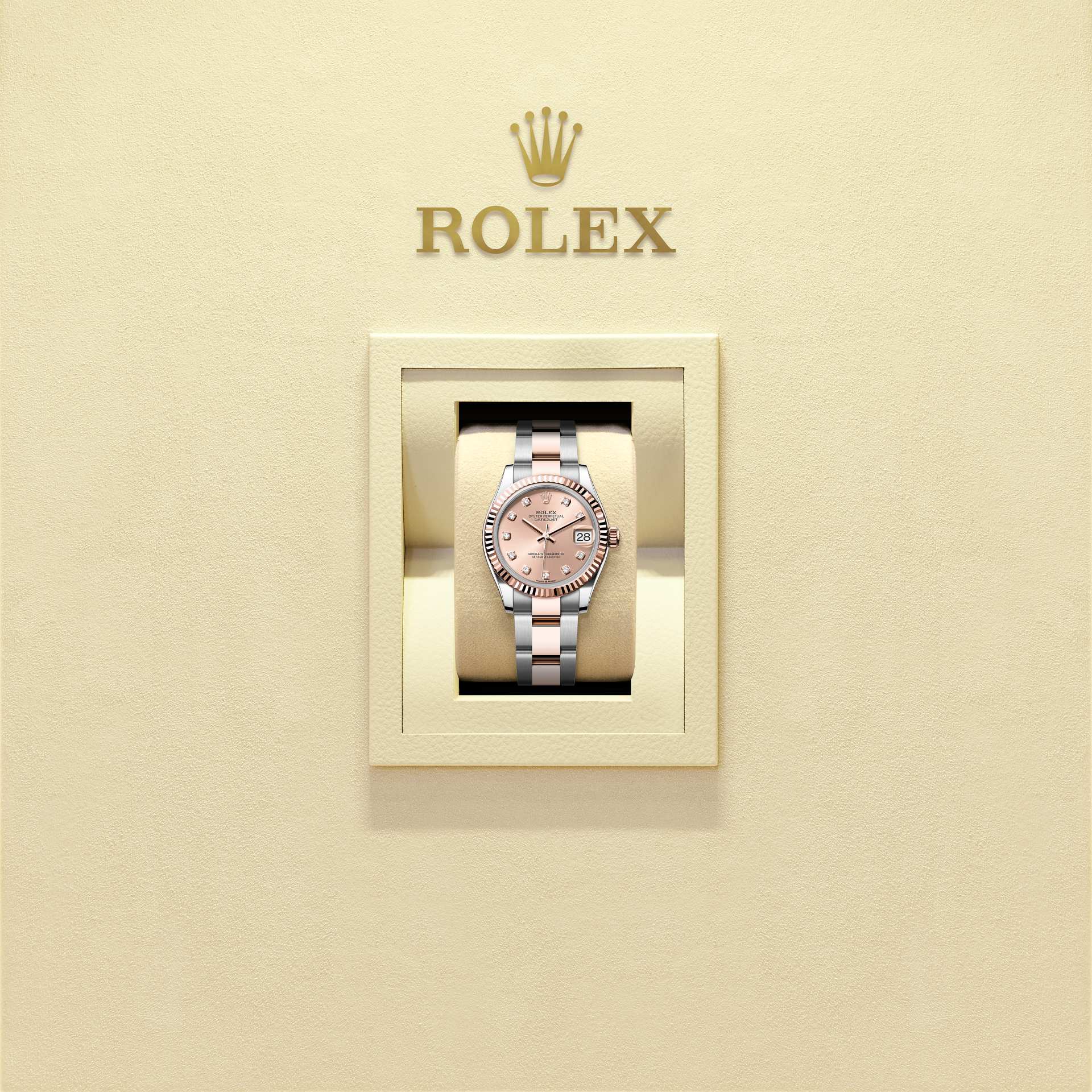 蚝式恒动日志型 31腕表永恒玫瑰金及蚝式钢款,搭配镶钻玫瑰金色表盘及蚝式(Oyster)表带。