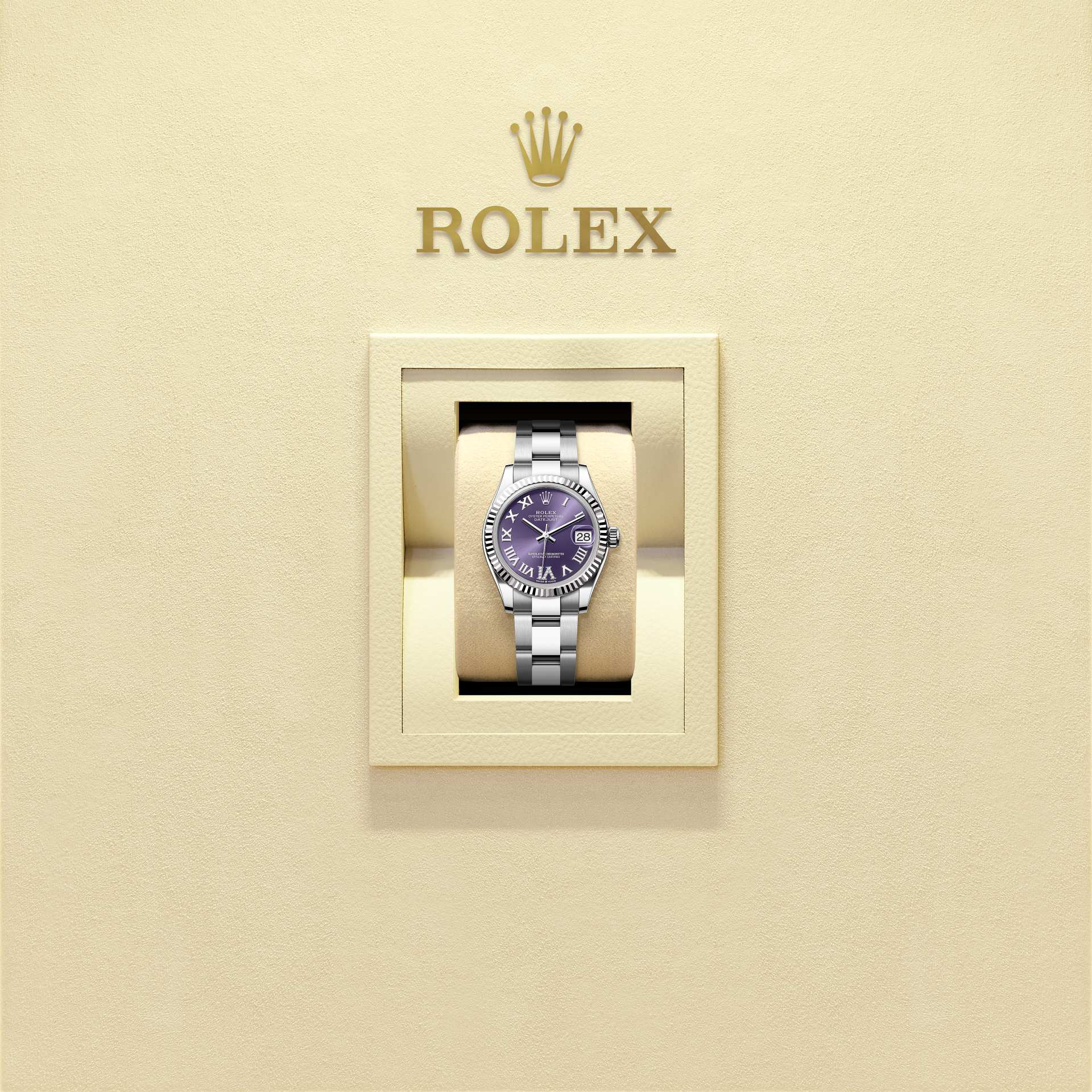 表盘设有镶11颗钻石的特大罗马数字VI。蚝式系列的许多表盘款式均采用太阳光线效果,折射出淡雅光泽。这种效果需要超卓的刷光技术,打造从表盘中央往外扩展的刻纹。