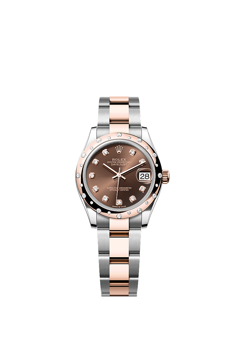 蚝式恒动日志型 31腕表永恒玫瑰金及蚝式钢款,搭配镶钻巧克力色表盘及蚝式(Oyster)表带。