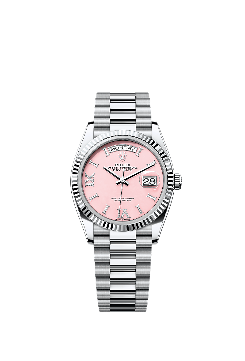 蚝式恒动星期日历型 36腕表铂金款,搭配镶钻粉红色蛋白石表盘、三角坑纹外圈及元首型(President)表带。