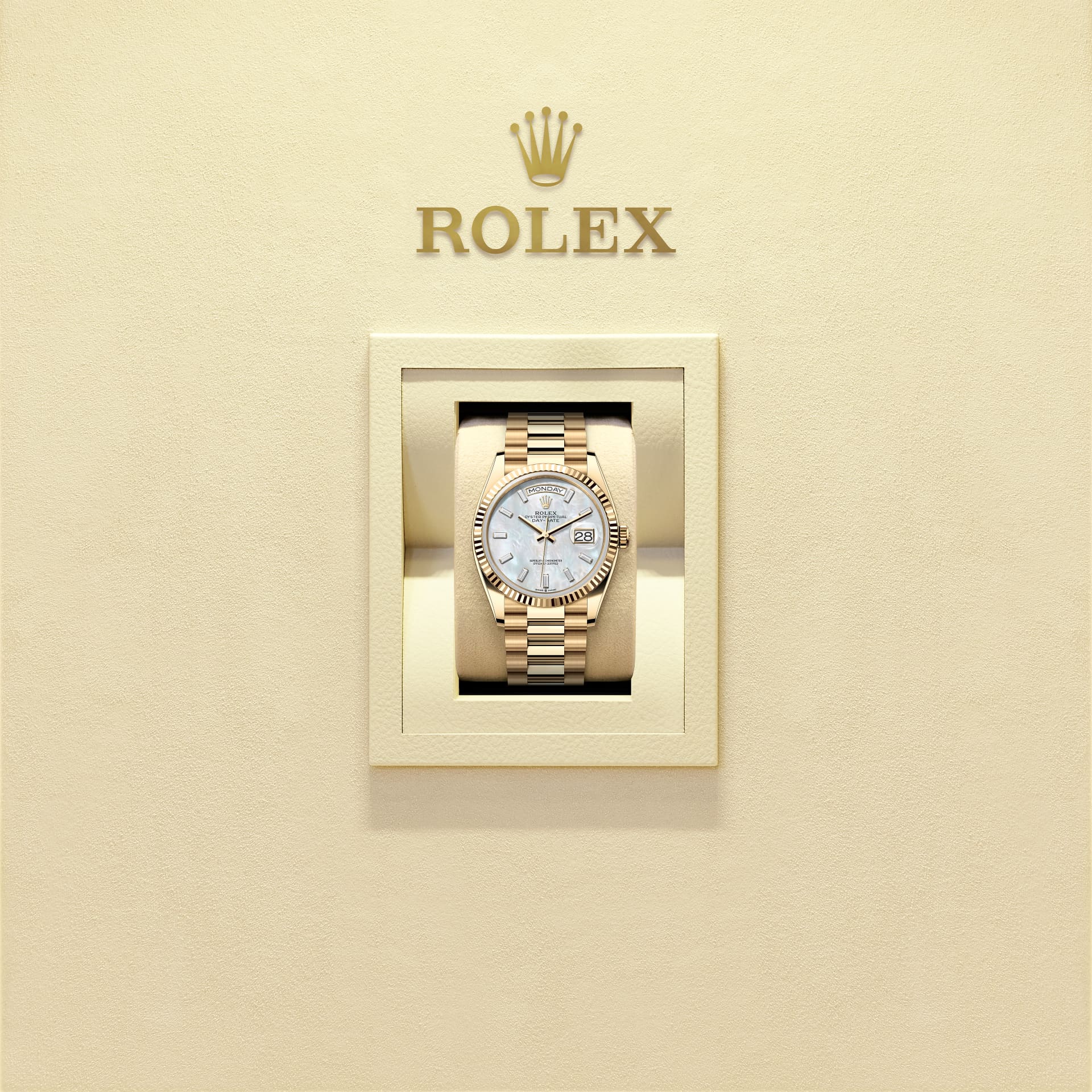 蚝式恒动星期日历型 36腕表18K黄金款,搭配镶钻白色珍珠母表盘、三角坑纹外圈及元首型(President)表带。
