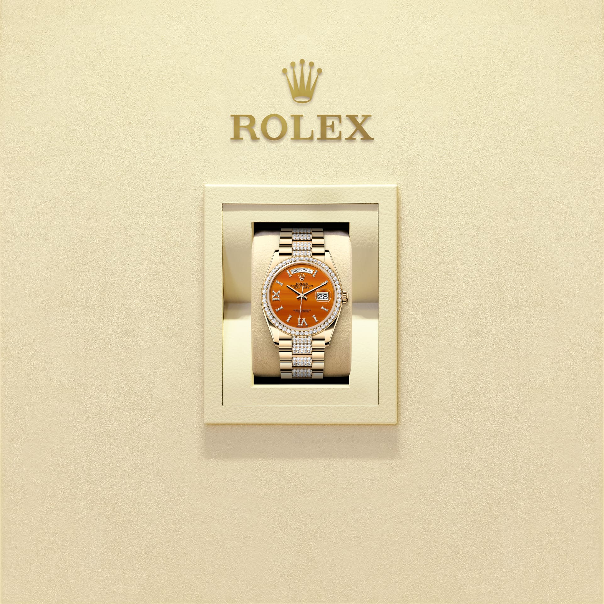 蚝式恒动星期日历型 36腕表18K黄金款,搭配镶钻红玉髓表盘、镶钻外圈及镶钻元首型(President)表带。