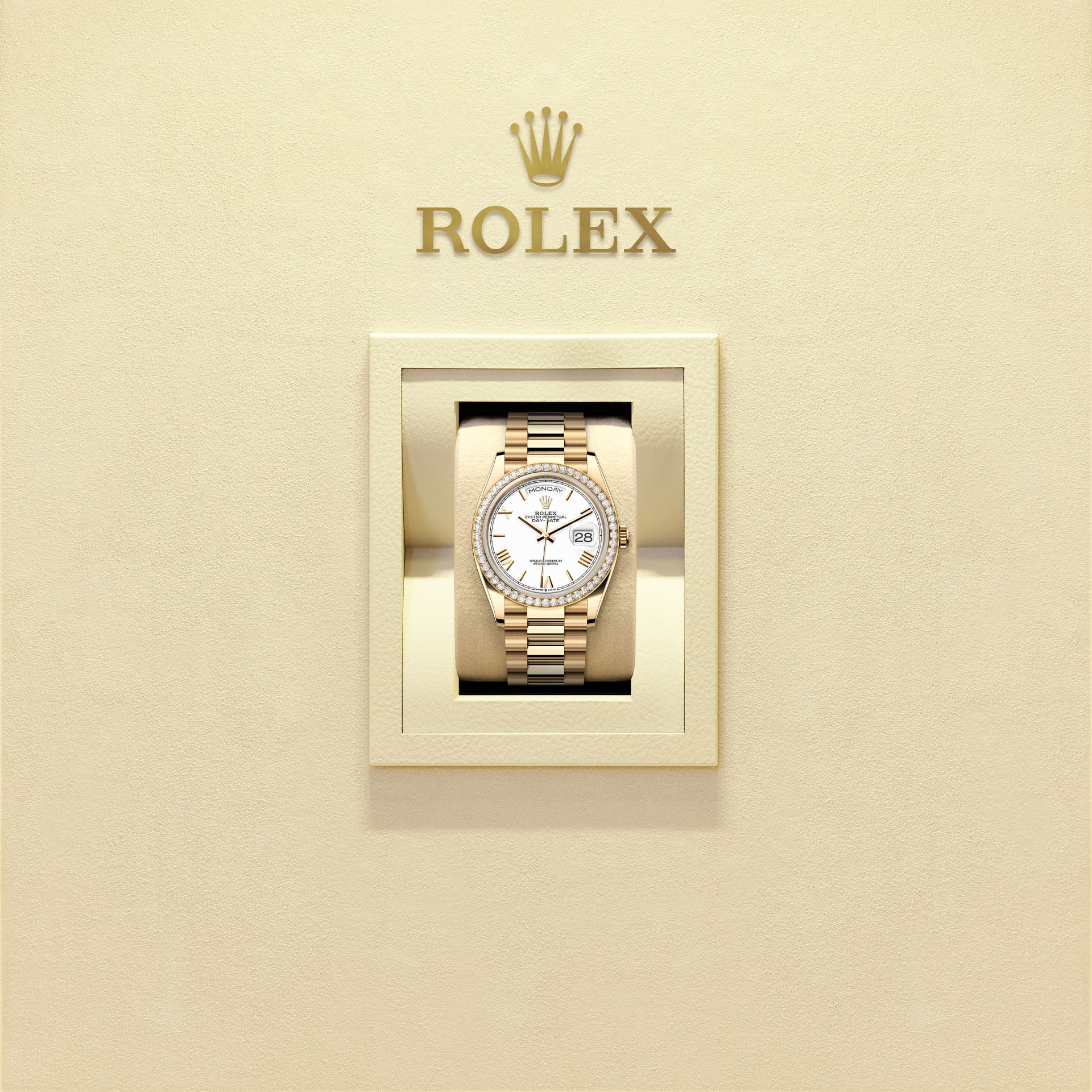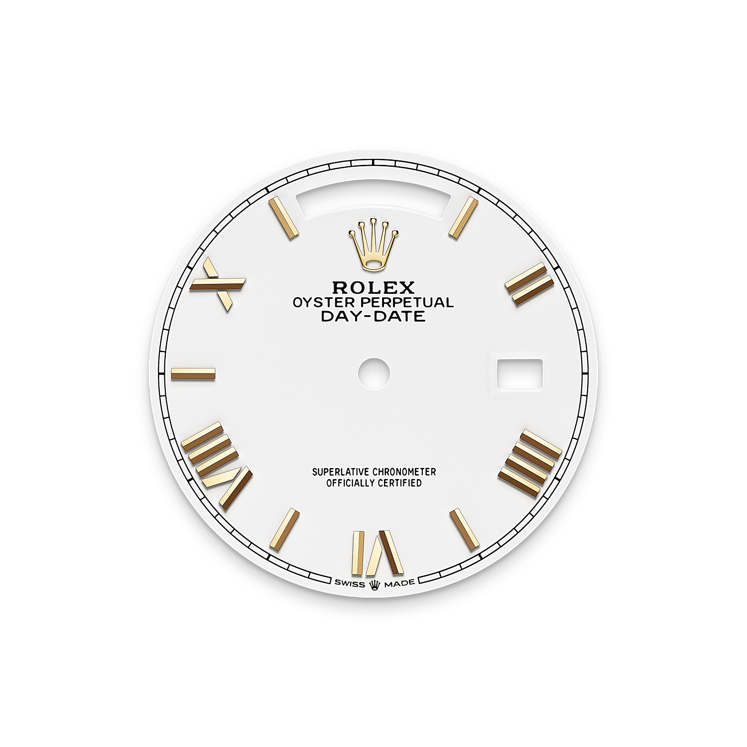 蚝式恒动星期日历型 36腕表18K黄金款,搭配白色表盘、镶钻外圈及元首型(President)表带。