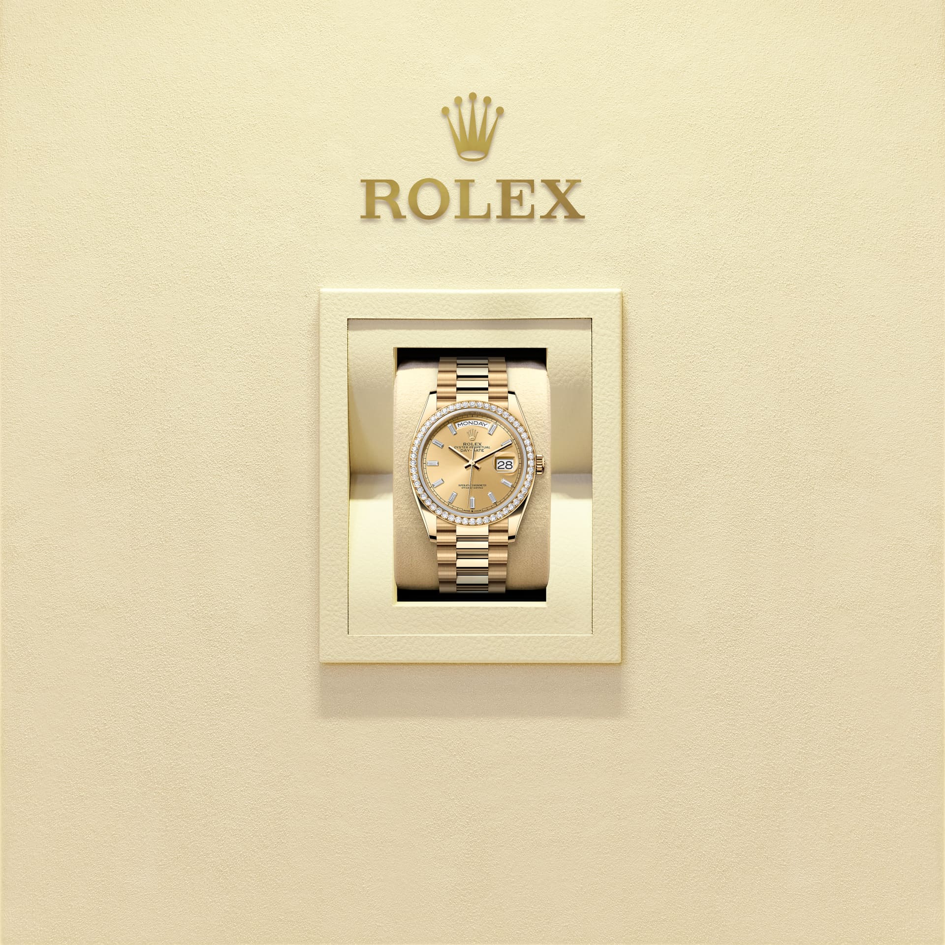 蚝式恒动星期日历型 36腕表18K黄金款,搭配镶钻香槟色表盘、镶钻外圈及元首型(President)表带。