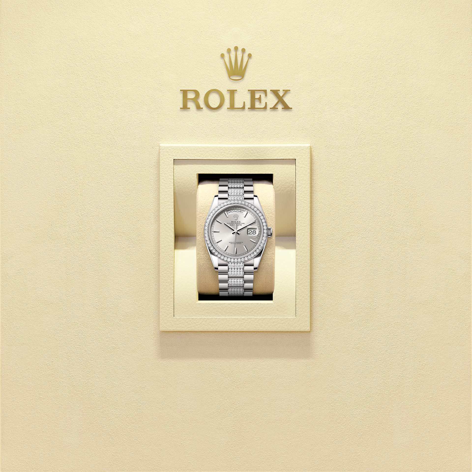 蚝式恒动星期日历型 36腕表18K白色黄金款,搭配银色表盘、镶钻外圈及镶钻元首型(President)表带。