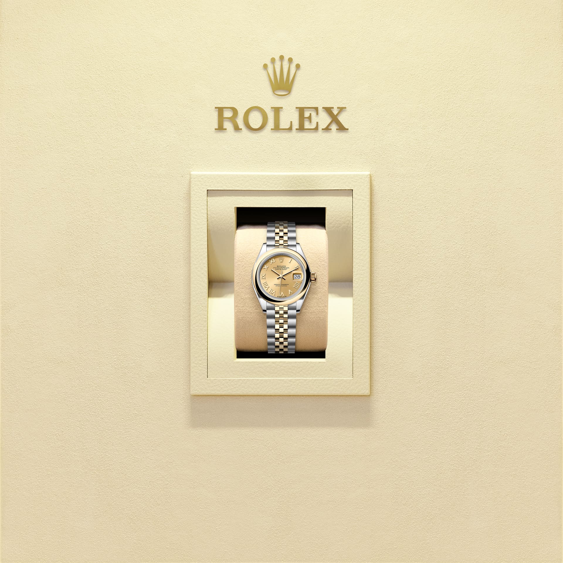 蚝式恒动女装日志型腕表黄金及蚝式钢款,搭配香槟色表盘及纪念型(Jubilee)表带。