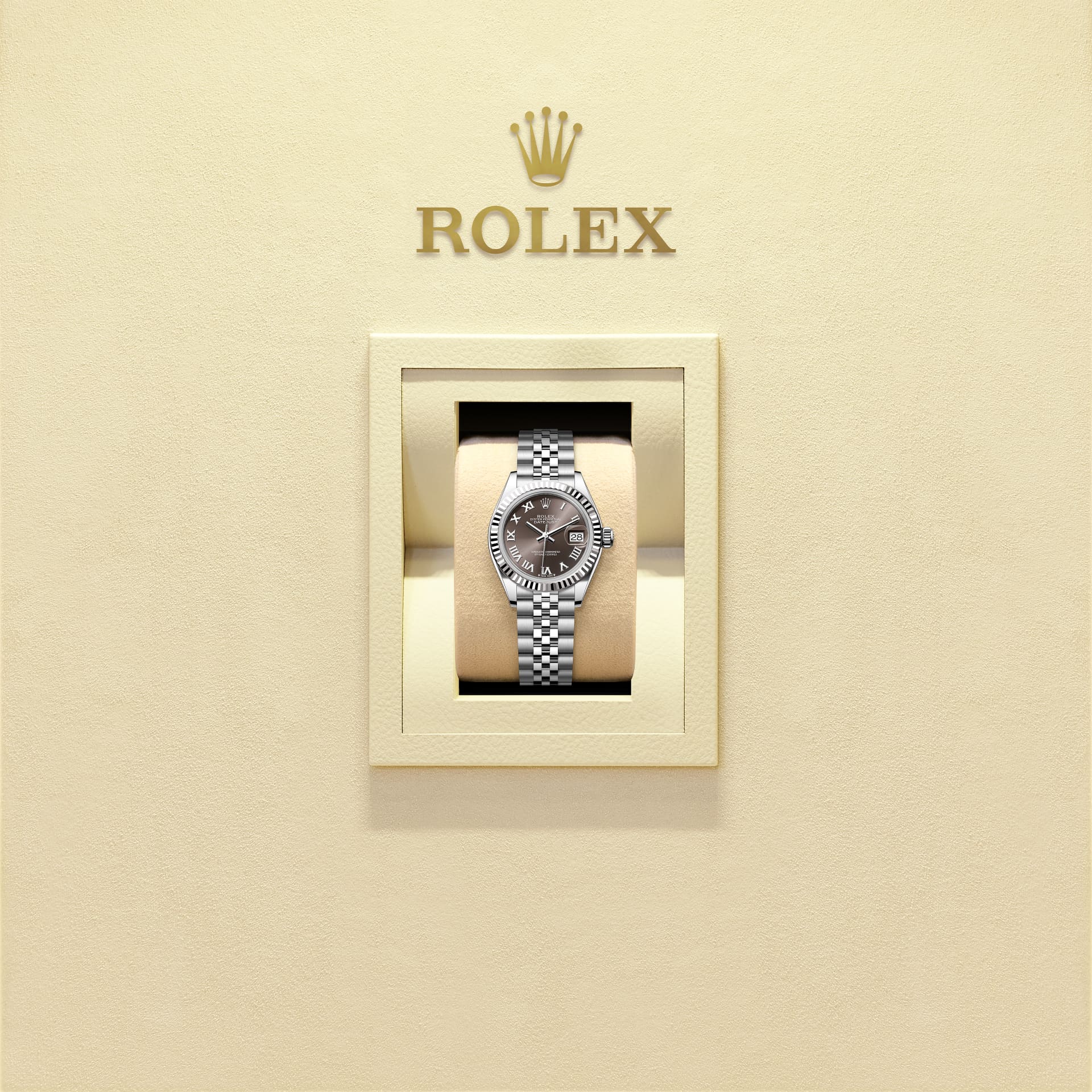 而底盖上可见的坑纹设计亦出于同样目的,并以特定的劳力士工具旋紧于表壳。及后,三角坑纹演变为一项美学设计元素,堪为劳力士的经典特色。时至今日,三角坑纹成为品牌腕表的特色,这款女装日志型的外圈以金制成。