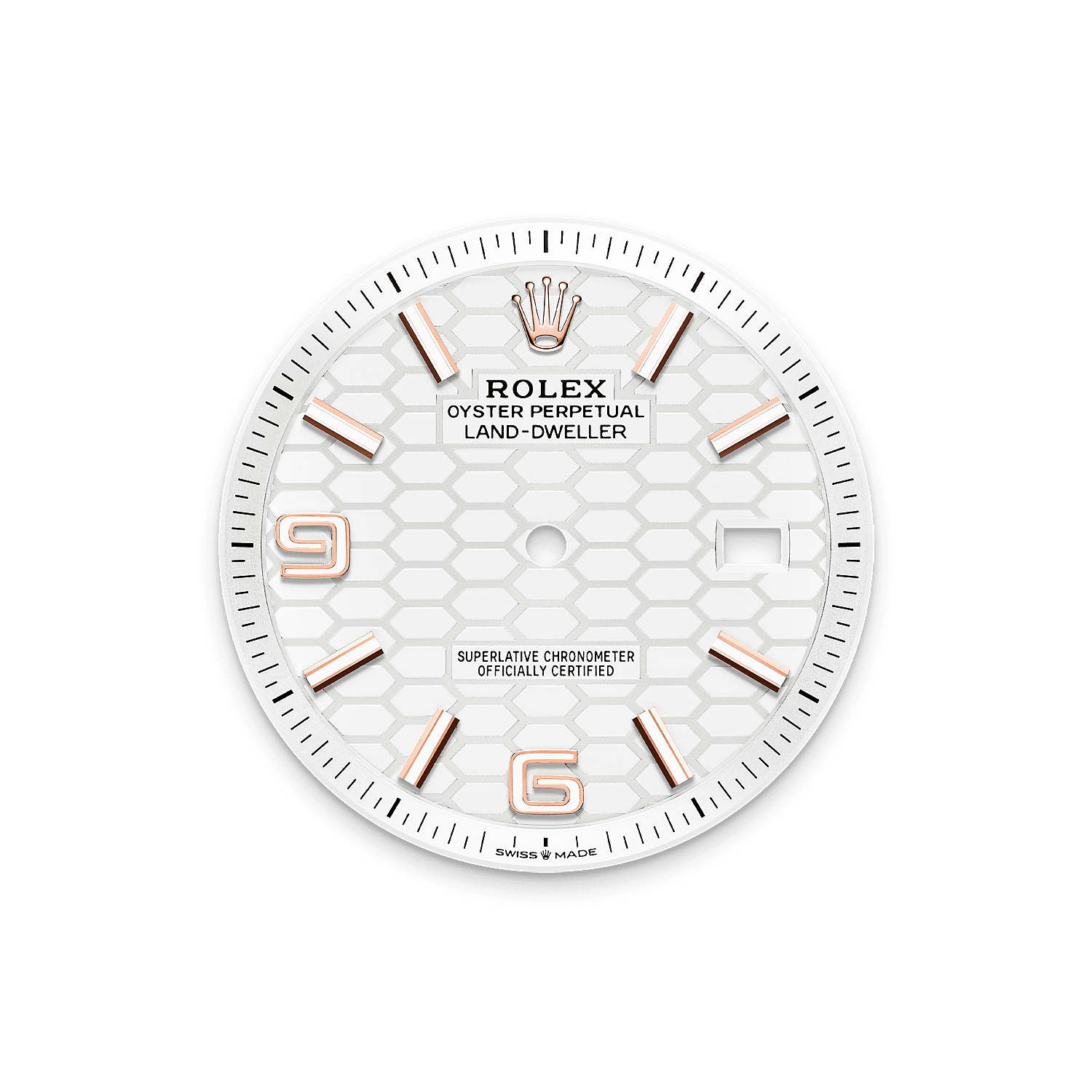 此表盘饰以蜂巢图案及磨砂修饰。表盘制作结合现代高科技与传统工艺,完全由劳力士自主研创。