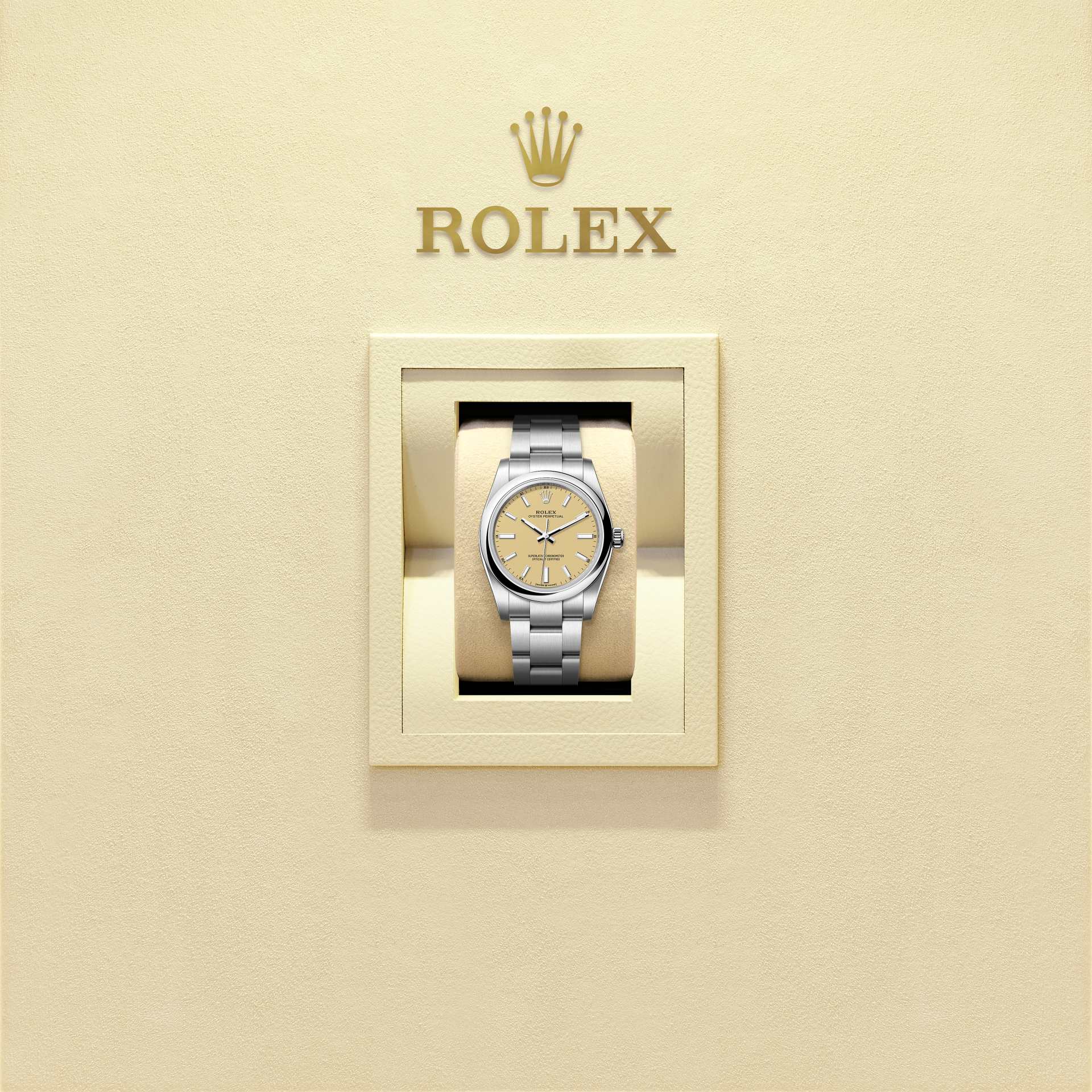蚝式恒动型 34腕表蚝式钢款,搭配米色表盘及蚝式(Oyster)表带。