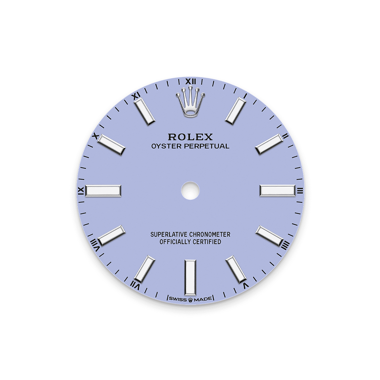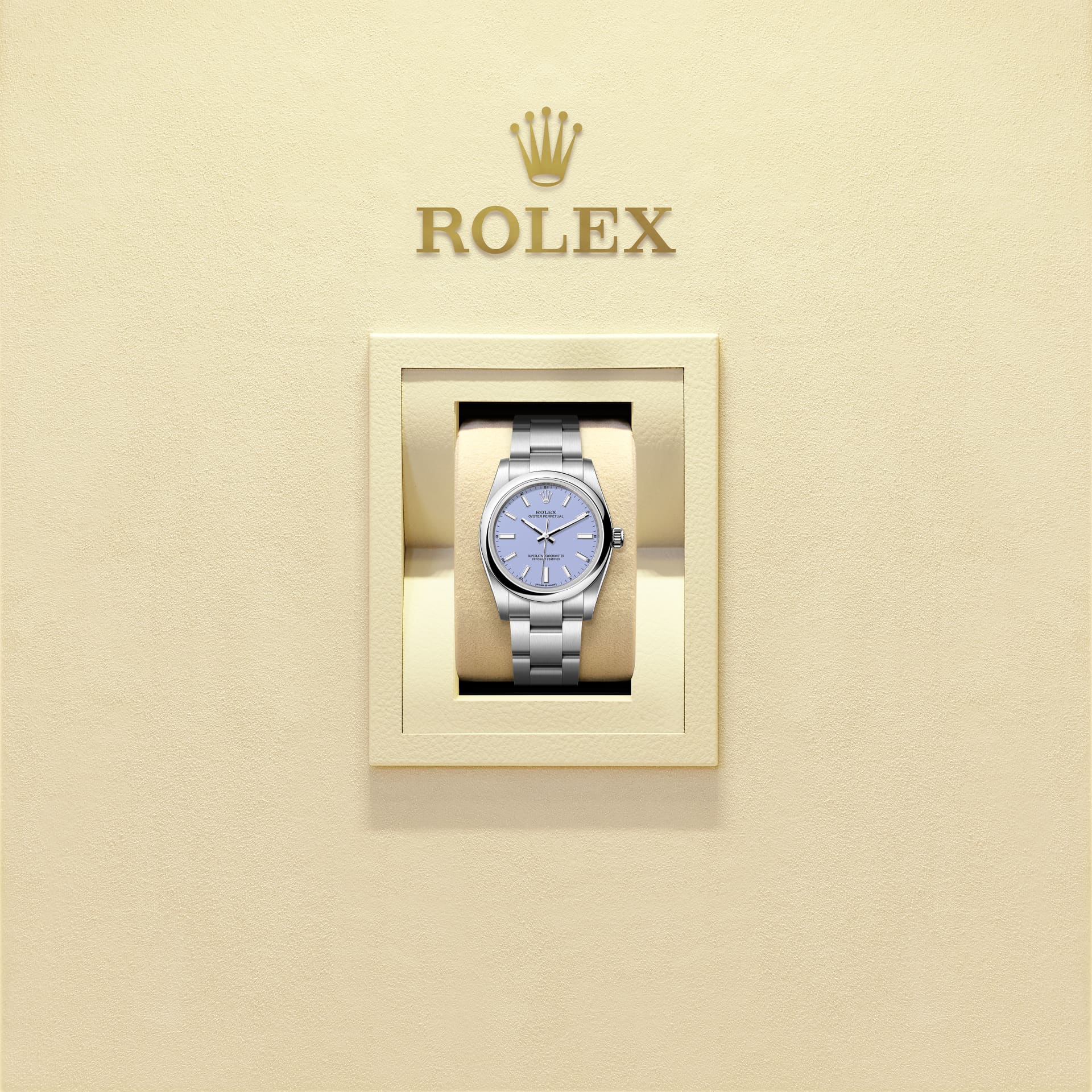 蚝式恒动型 34腕表搭配薰衣草紫色表盘及蚝式(Oyster)表带。