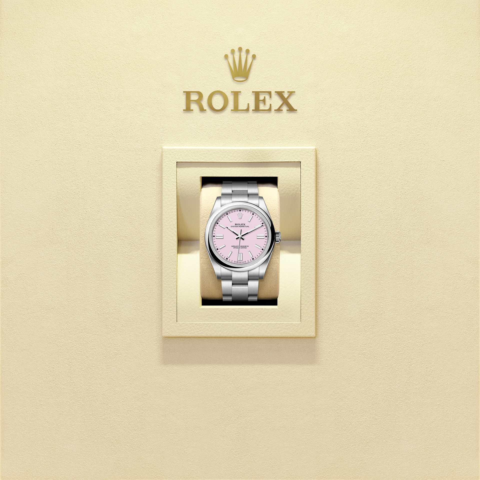 蚝式恒动型 41腕表搭配糖果粉红色表盘及蚝式(Oyster)表带。