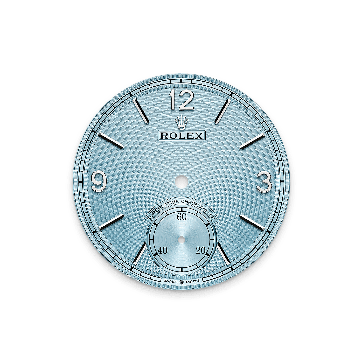 冰藍色錶面飾以穀粒紋。自6點鐘位置的小秒針盤開始,極具立體感的裝飾圓窗幾何圖案重複出現,倍顯與眾不同。錶面的分鐘刻度軌道周圍飾有一圈精美的波形花紋邊框。錶面圖案由機刻雕花工藝打造,即運用車削刀具,在物體表面雕刻圖案。此款錶面設計融蘊勞力士專業知識與創意巧思,同時亦向傳統製錶藝術致敬,為恒動系列再添力作。一如18K金錶款,Perpetual 1908 950鉑金款腕錶的錶面搭配阿拉伯數字3、9及12,以及同樣的刻面鐘點標記和指針設計。