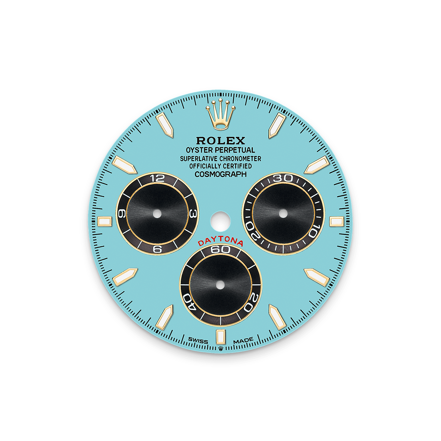 Oyster Perpetual Cosmograph Daytona腕錶18K黃金款,搭配綠松石藍色及黑色錶面及Oysterflex錶帶,黑色Cerachrom外圈設測速計。