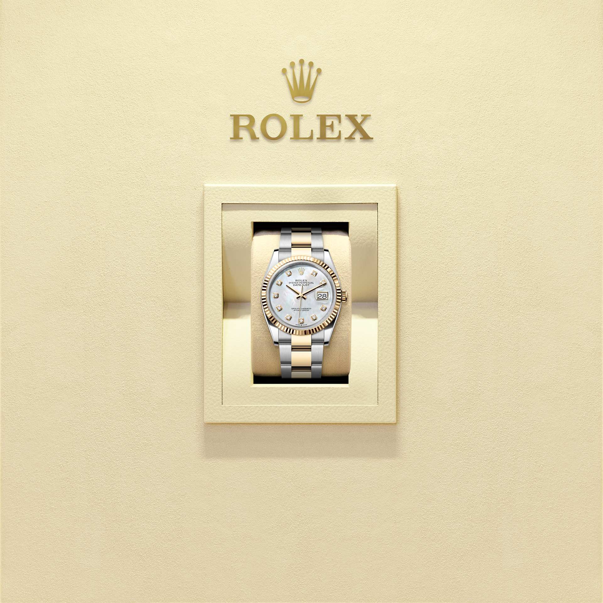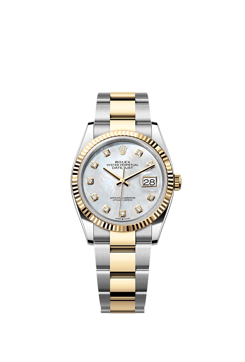 Oyster Perpetual Datejust 36腕錶黃金及蠔式鋼款,搭配鑲鑽白色珍珠母錶面及蠔式(Oyster)錶帶。