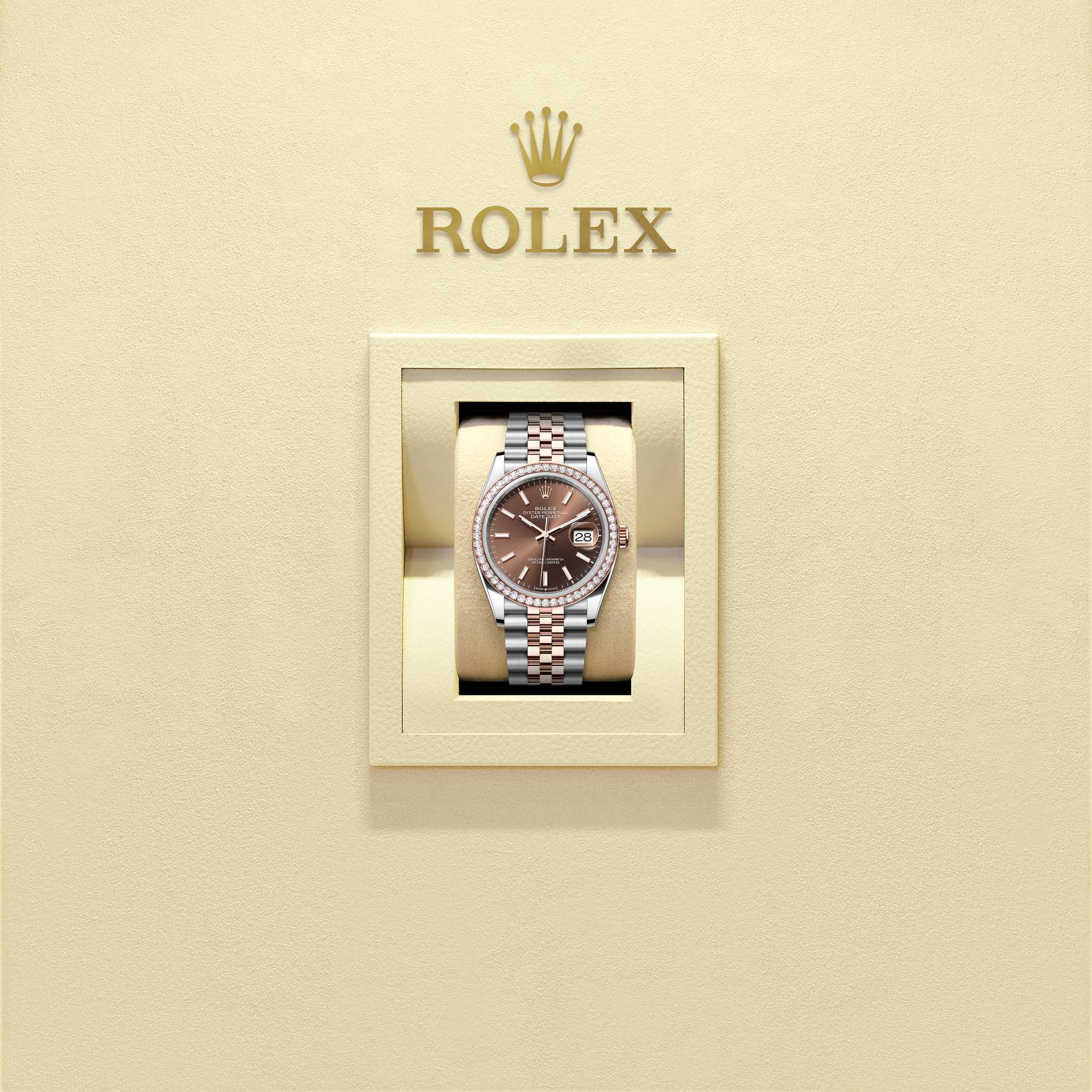 Oyster Perpetual Datejust 36腕錶永恒玫瑰金及蠔式鋼款,搭配巧克力色錶面及紀念型(Jubilee)錶帶。