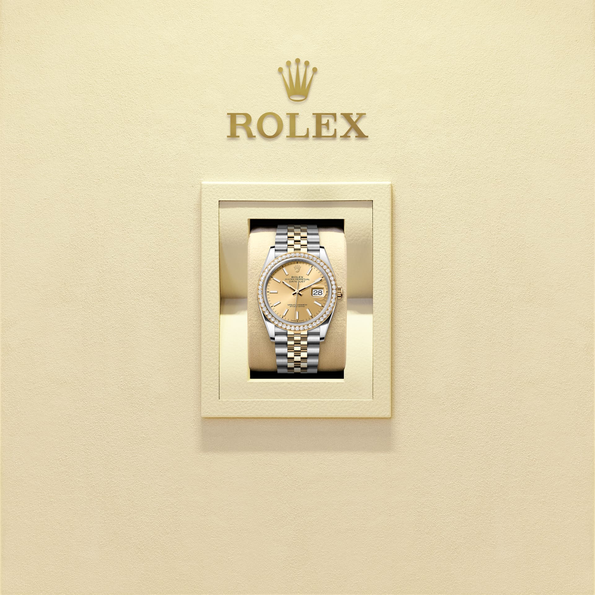 Oyster Perpetual Datejust 36腕錶黃金及蠔式鋼款,搭配香檳色錶面及紀念型(Jubilee)錶帶。