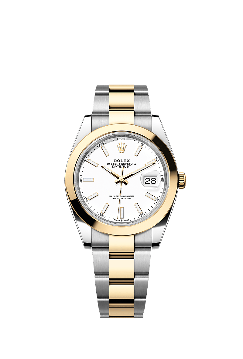 Oyster Perpetual Datejust 41腕錶黃金及蠔式鋼款,搭配白色錶面及蠔式(Oyster)錶帶。