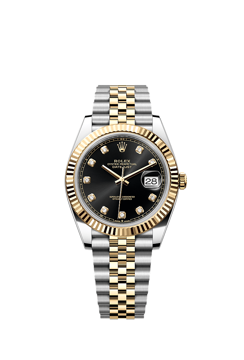 Oyster Perpetual Datejust 41腕錶黃金及蠔式鋼款,搭配鑲鑽亮黑色錶面及紀念型(Jubilee)錶帶。