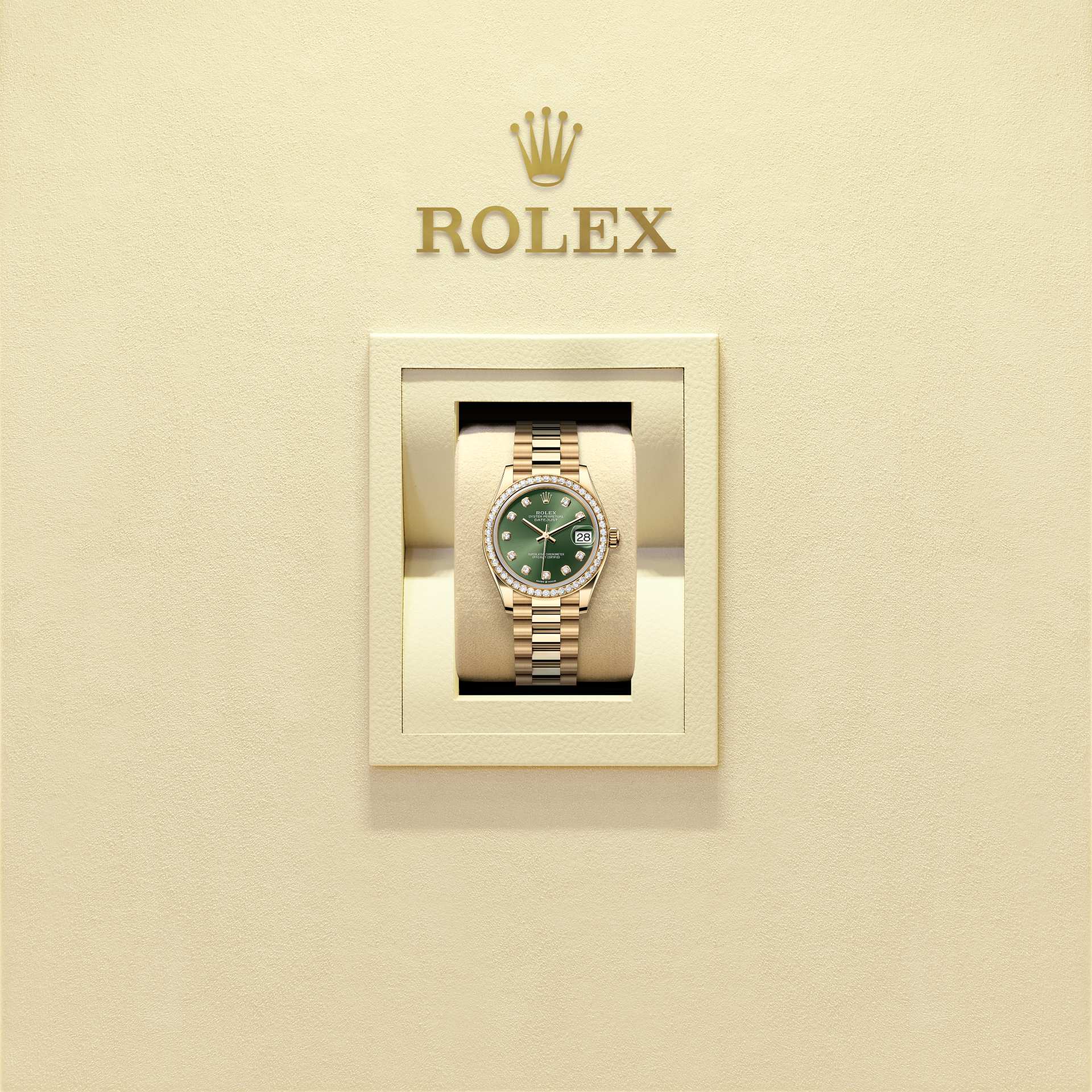Oyster Perpetual Datejust 31腕錶18K黃金款,搭配鑲鑽橄欖綠色錶面及元首型(President)錶帶。