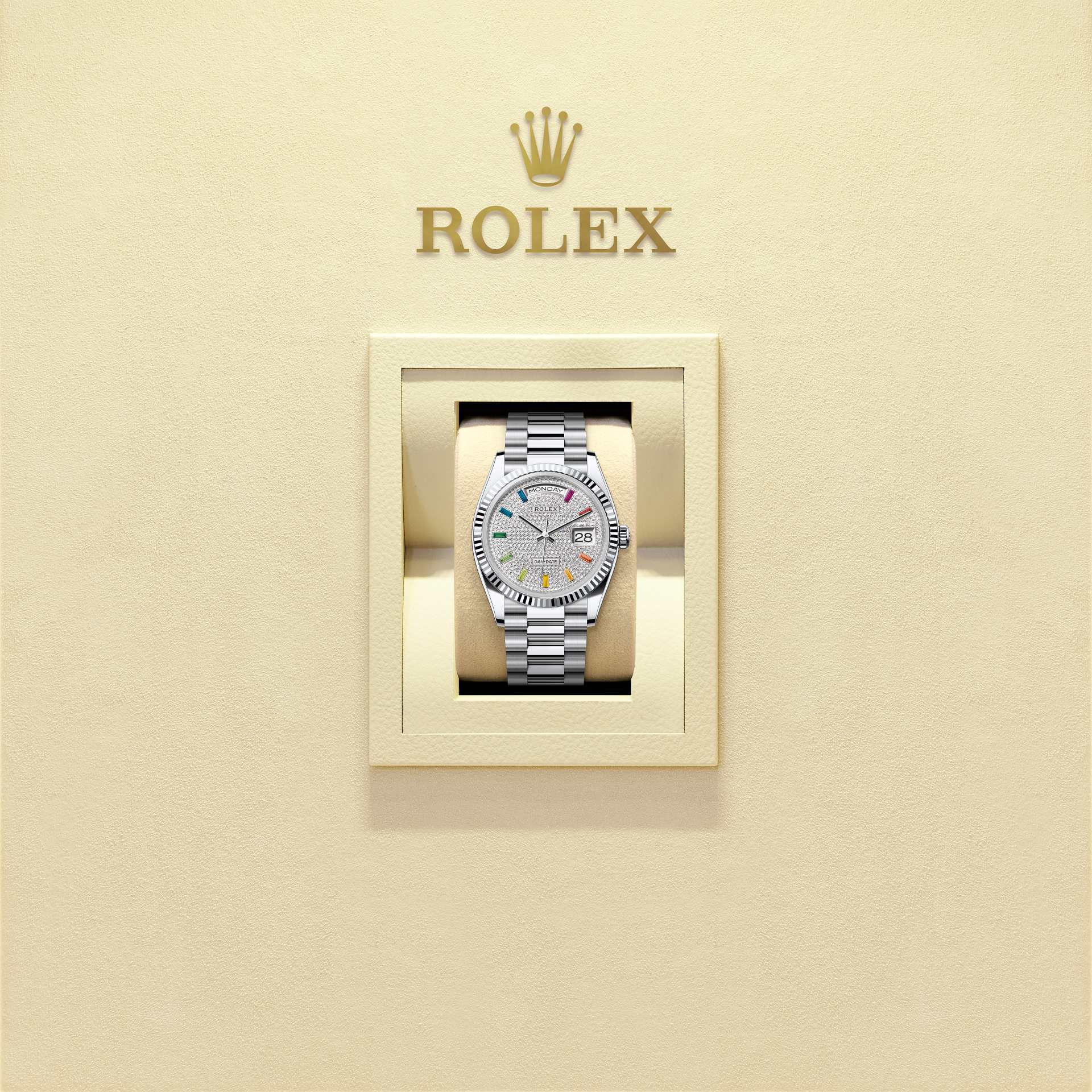 而底蓋上可見的坑紋設計亦出於同樣目的,並以特定的勞力士工具旋緊於錶殼。及後,三角坑紋演變為一項美學設計元素,堪為勞力士的經典特色。時至今日,三角坑紋成為品牌腕錶的特色,這款Day-Date 36的外圈以鉑金製成。