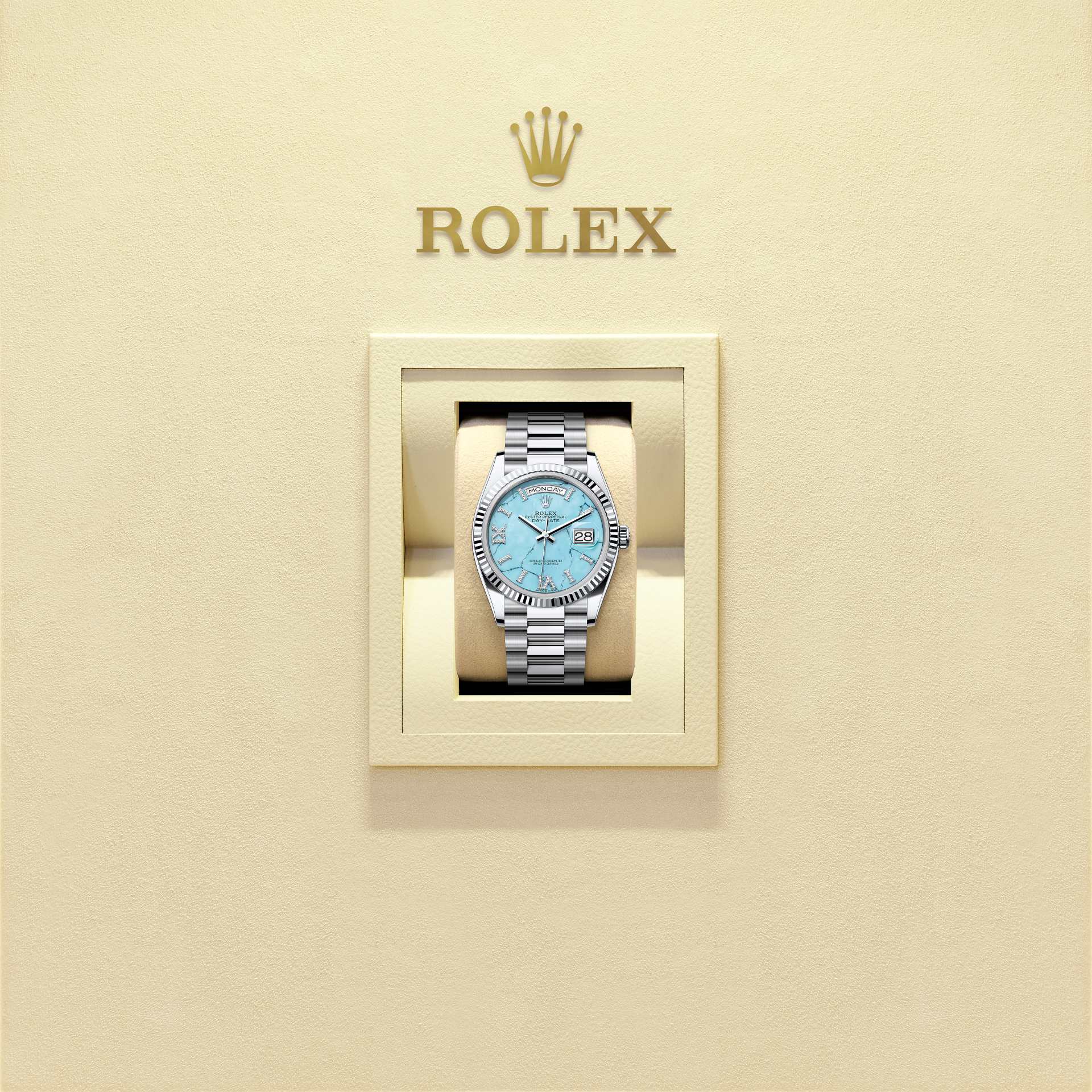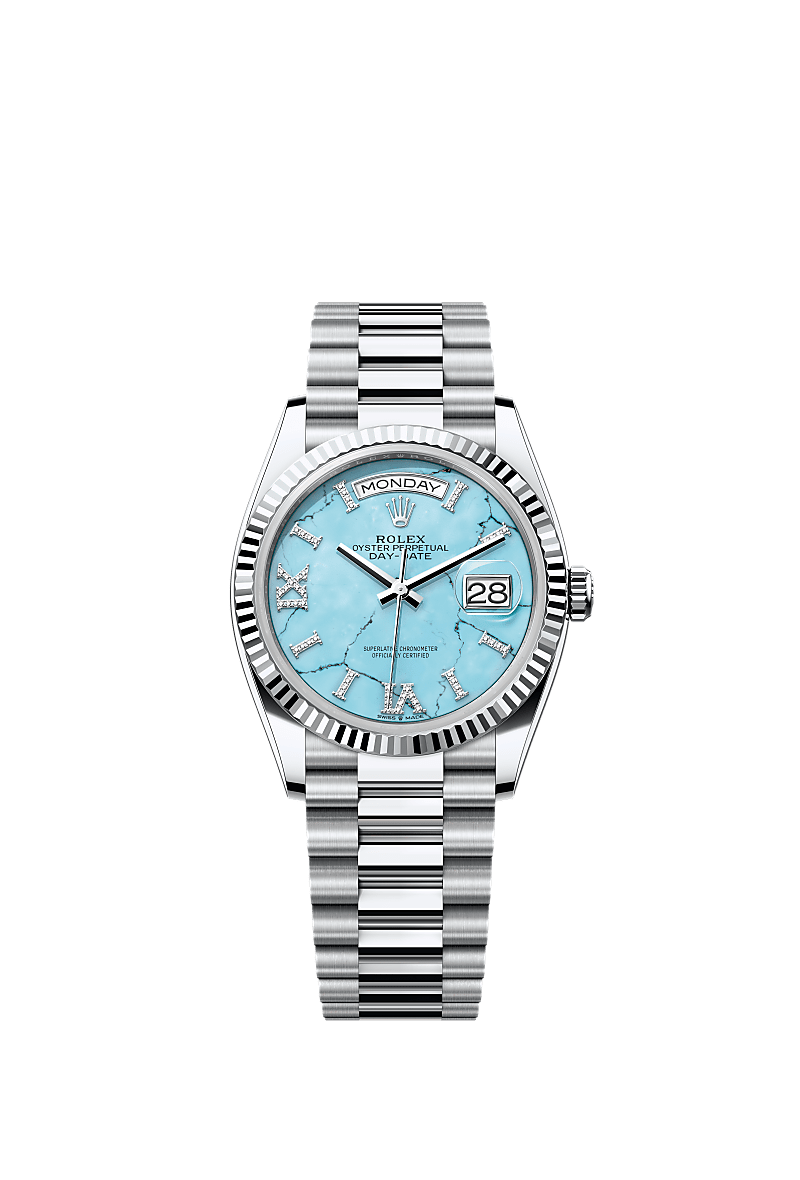 Oyster Perpetual Day-Date 36腕錶鉑金款,搭配鑲鑽綠松石錶面、三角坑紋外圈及元首型(President)錶帶。