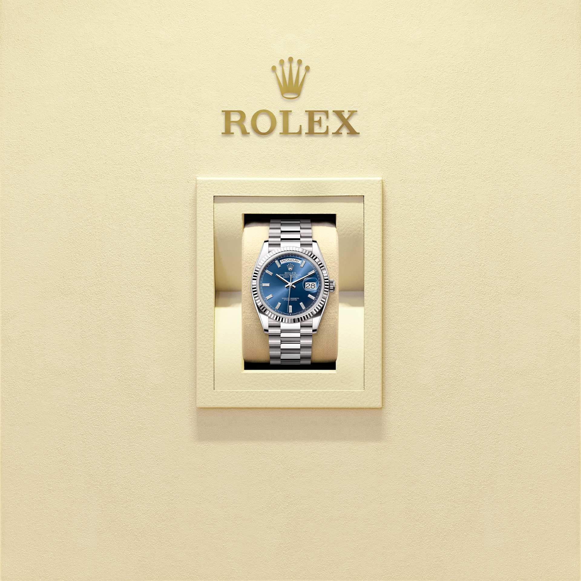 而底蓋上可見的坑紋設計亦出於同樣目的,並以特定的勞力士工具旋緊於錶殼。及後,三角坑紋演變為一項美學設計元素,堪為勞力士的經典特色。時至今日,三角坑紋成為品牌腕錶的特色,這款Day-Date 36的外圈以金製成。