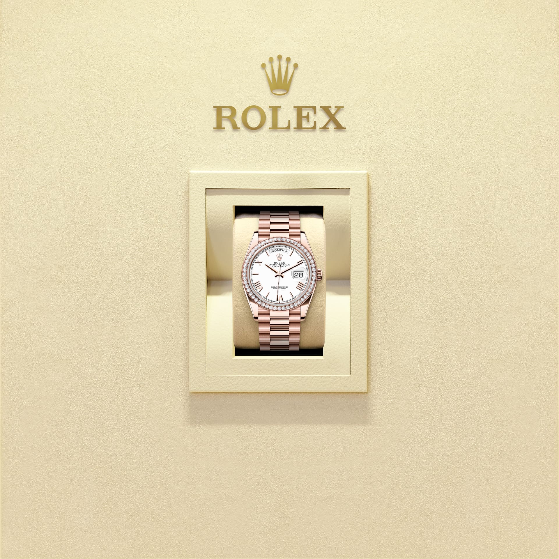 Oyster Perpetual Day-Date 36腕錶18K永恒玫瑰金款,搭配白色錶面、鑲鑽外圈及元首型(President)錶帶。