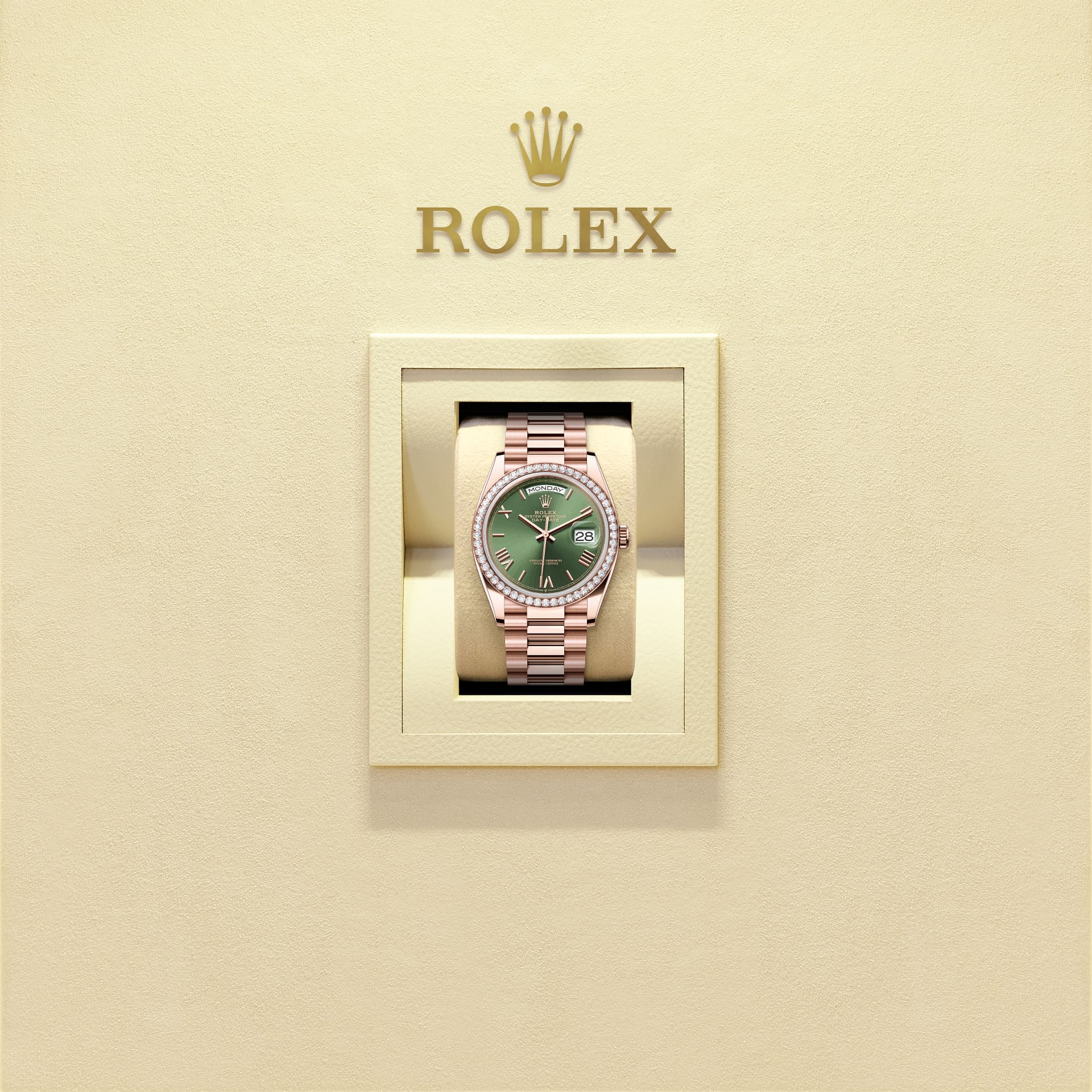 Oyster Perpetual Day-Date 36腕錶18K永恒玫瑰金款,搭配橄欖綠色錶面、鑲鑽外圈及元首型(President)錶帶。
