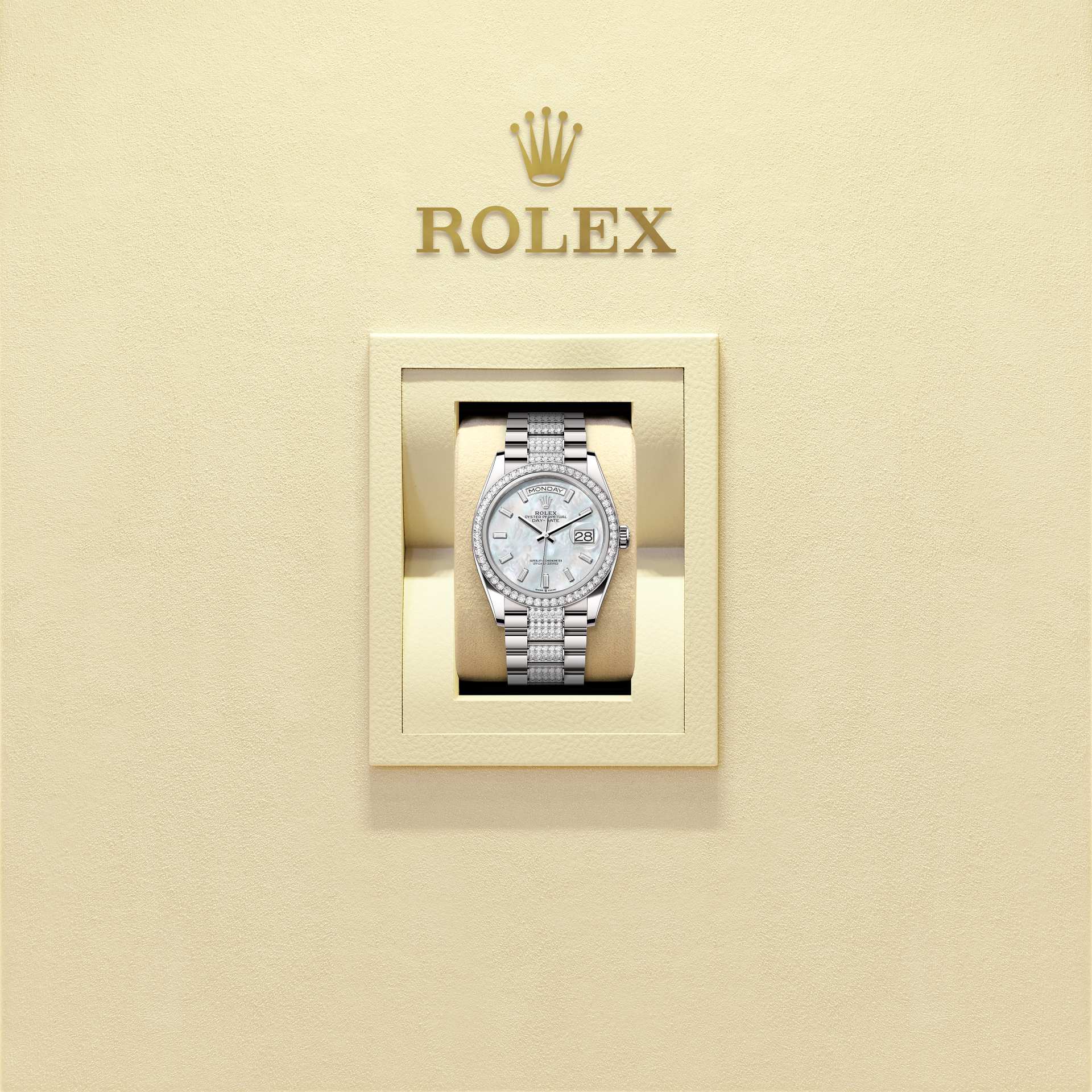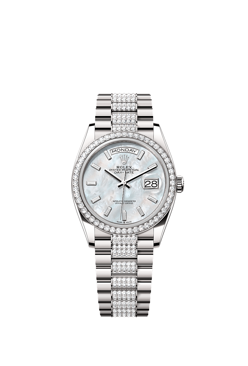 Oyster Perpetual Day-Date 36腕錶18K白色黃金款,搭配鑲鑽白色珍珠母錶面、鑲鑽外圈及鑲鑽元首型(President)錶帶。
