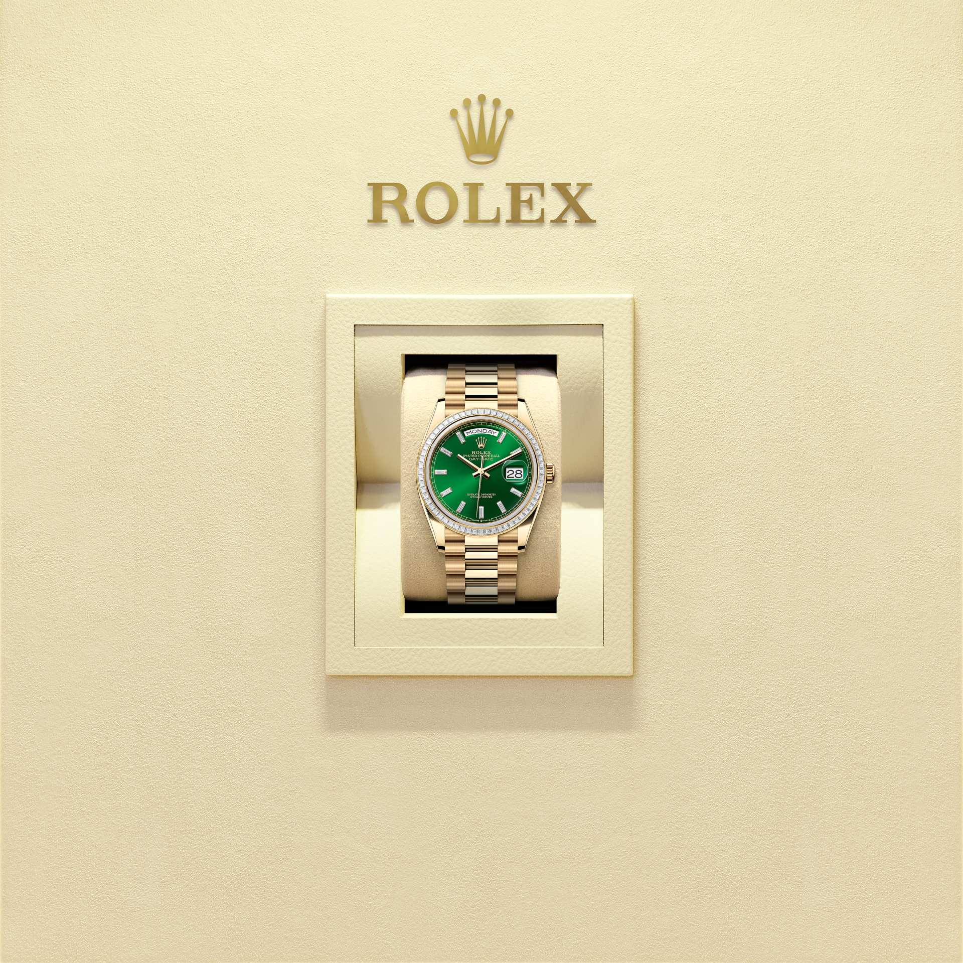 Oyster Perpetual Day-Date 36腕錶18K黃金款,搭配鑲鑽亮綠色錶面、鑲鑽外圈及元首型(President)錶帶。
