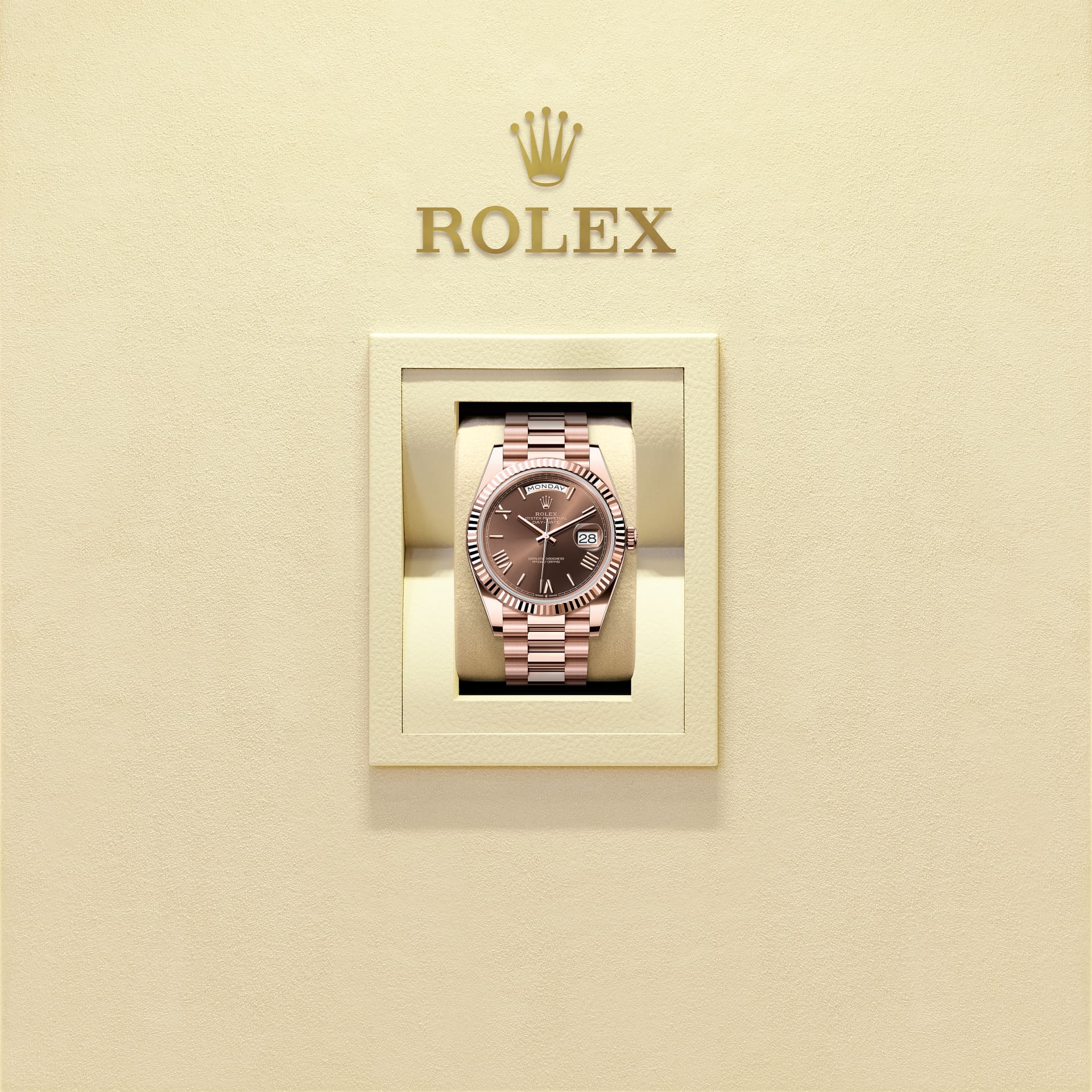 Oyster Perpetual Day-Date 40腕錶18K永恒玫瑰金款,搭配巧克力色錶面、三角坑紋外圈及元首型(President)錶帶。
