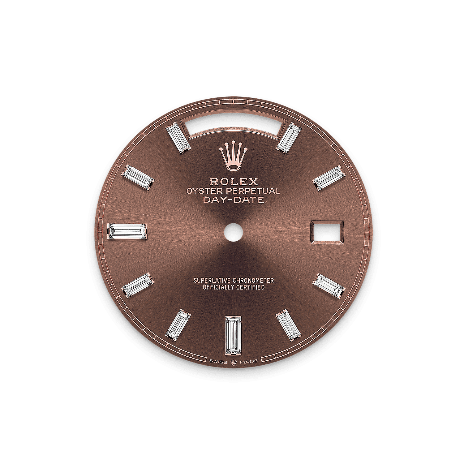 Oyster Perpetual Day-Date 40腕錶18K永恒玫瑰金款,搭配鑲鑽巧克力色錶面、三角坑紋外圈及元首型(President)錶帶。