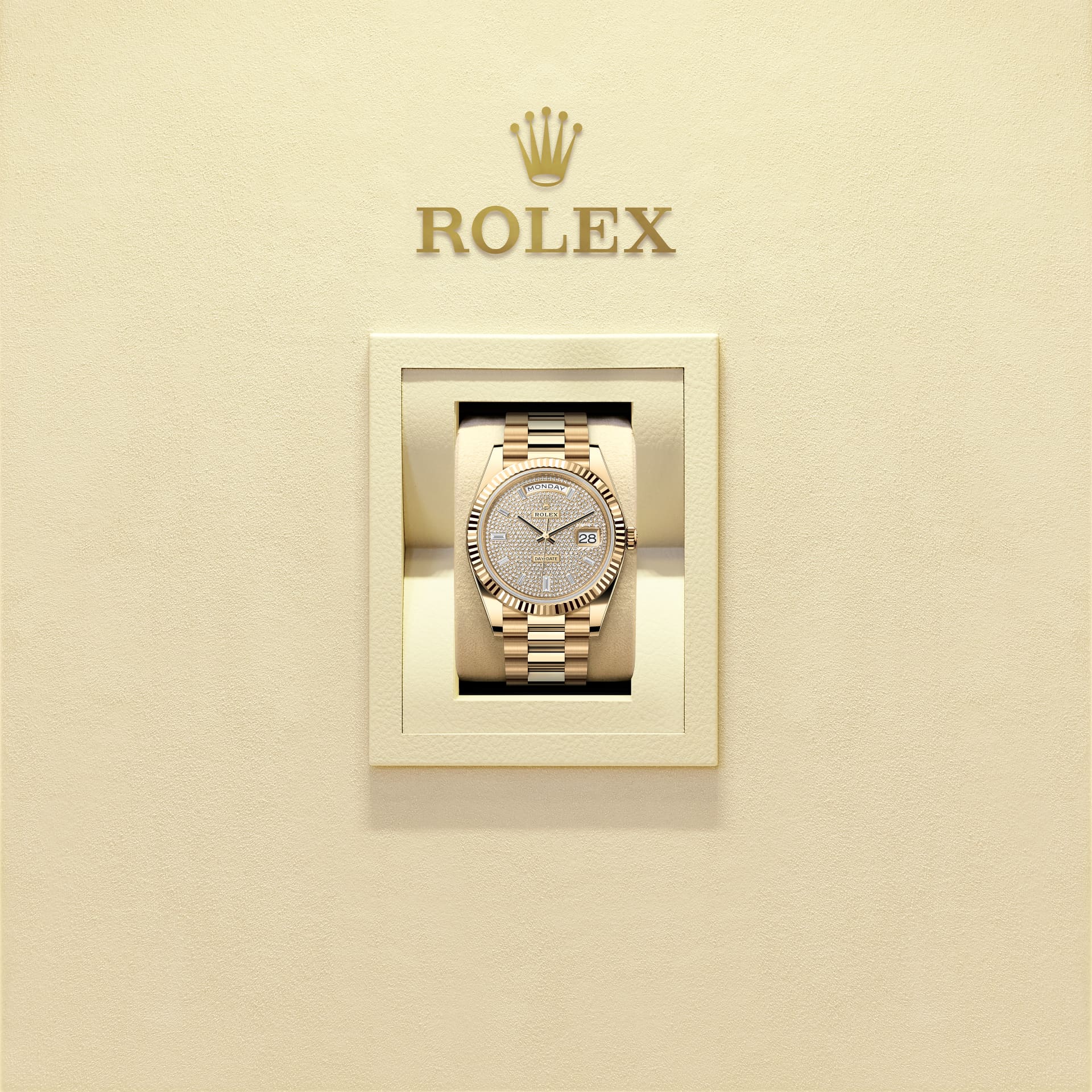 而底蓋上可見的坑紋設計亦出於同樣目的,並以特定的勞力士工具旋緊於錶殼。及後,三角坑紋演變為一項美學設計元素,堪為勞力士的經典特色。時至今日,三角坑紋成為品牌腕錶的特色,這款Day-Date 40的外圈以金製成。