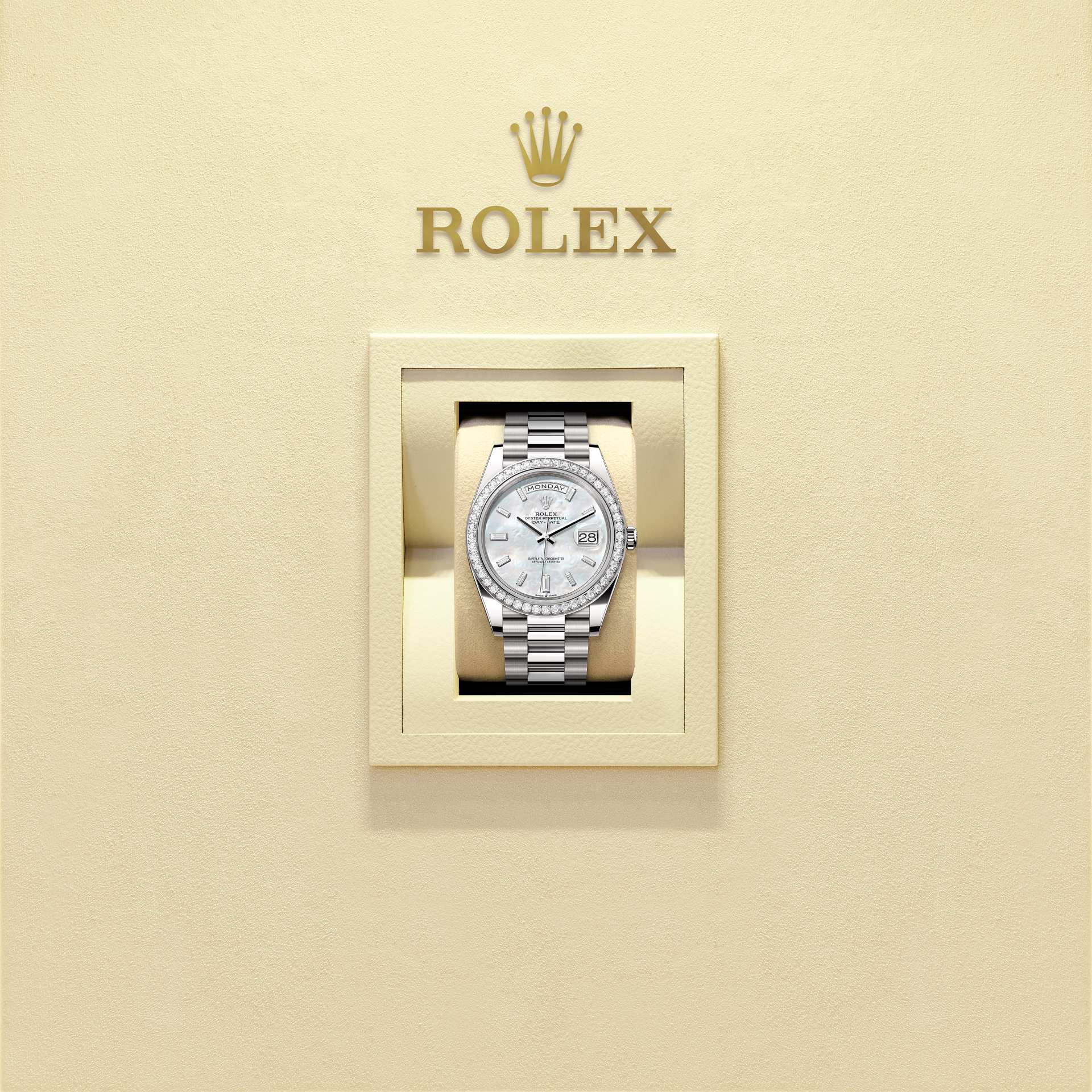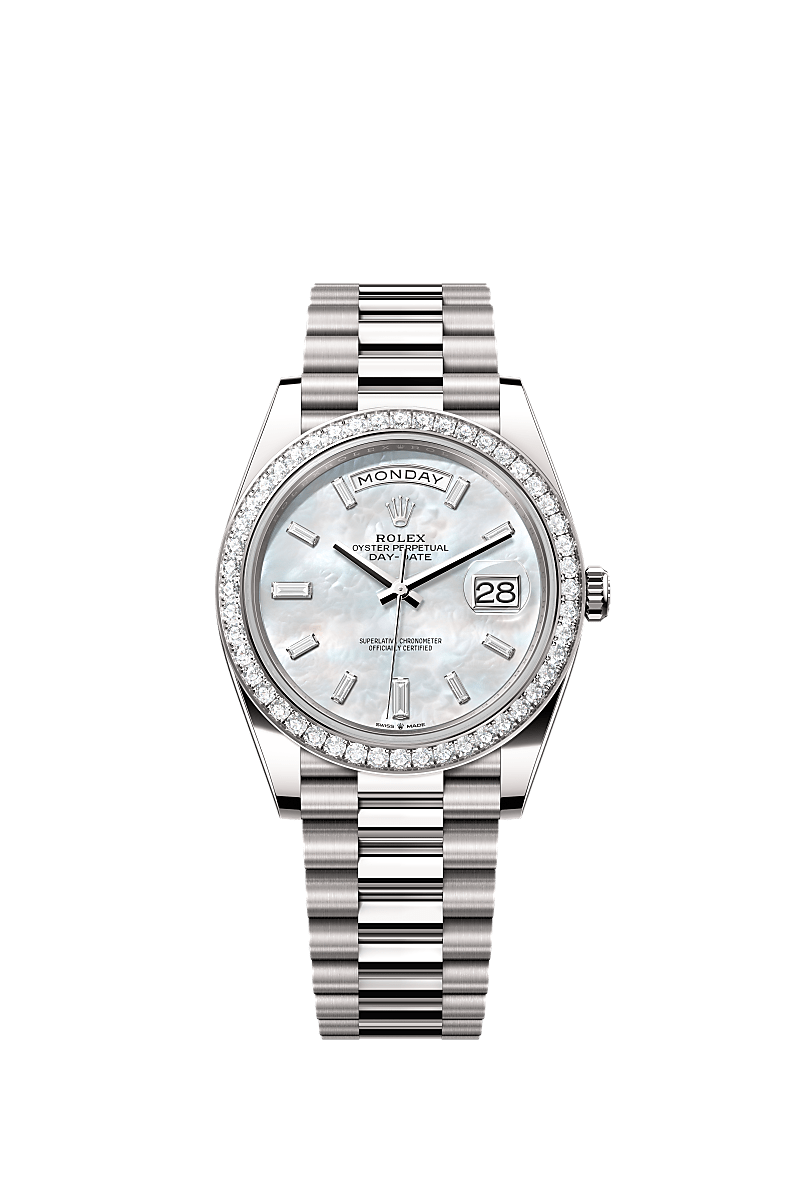 Oyster Perpetual Day-Date 40腕錶18K白色黃金款,搭配鑲鑽白色珍珠母錶面、鑲鑽外圈及元首型(President)錶帶。