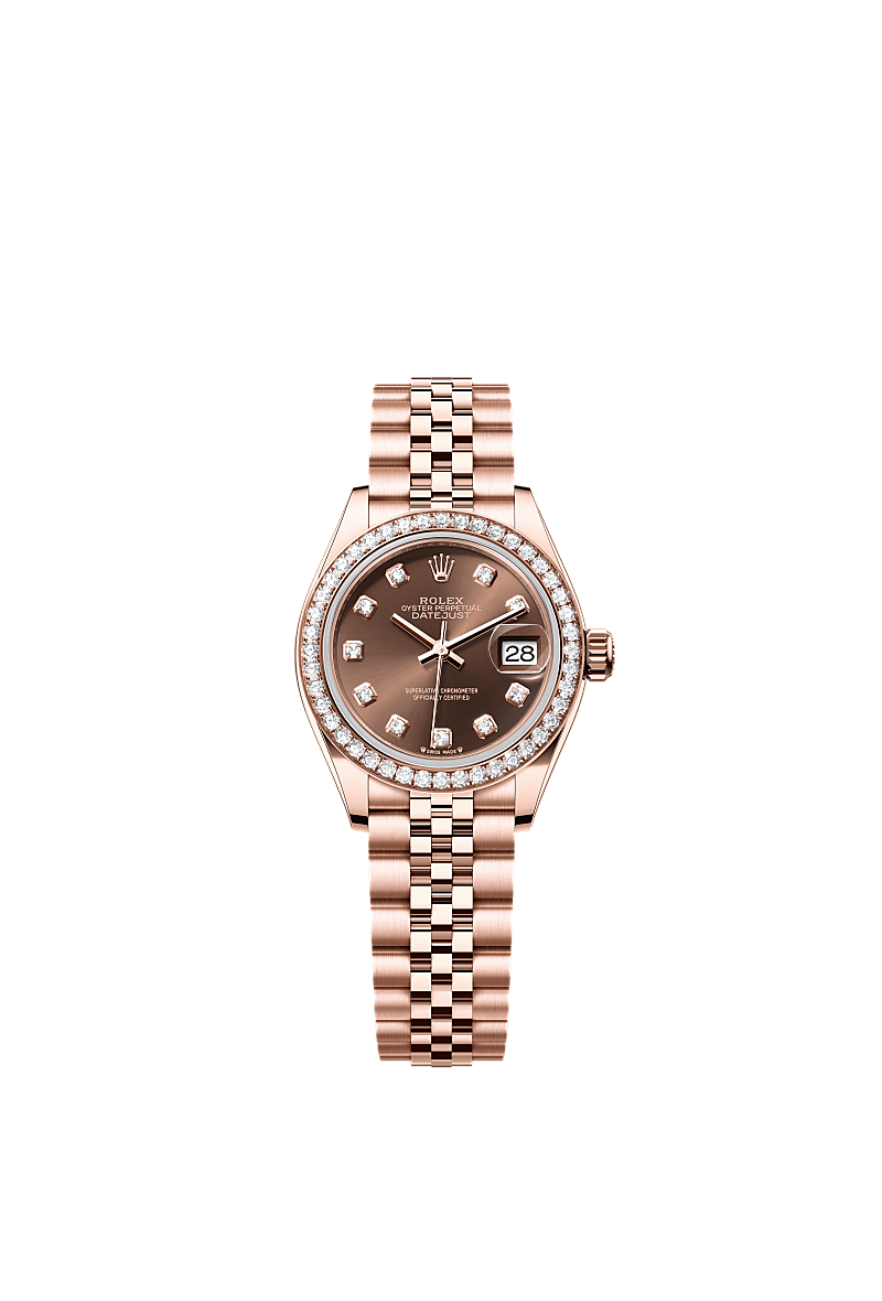 Lady-Datejust, 蠔式,28毫米,鑽石及永恒玫瑰金, 錶面 : 巧克力色,鑲鑽石, Rolex