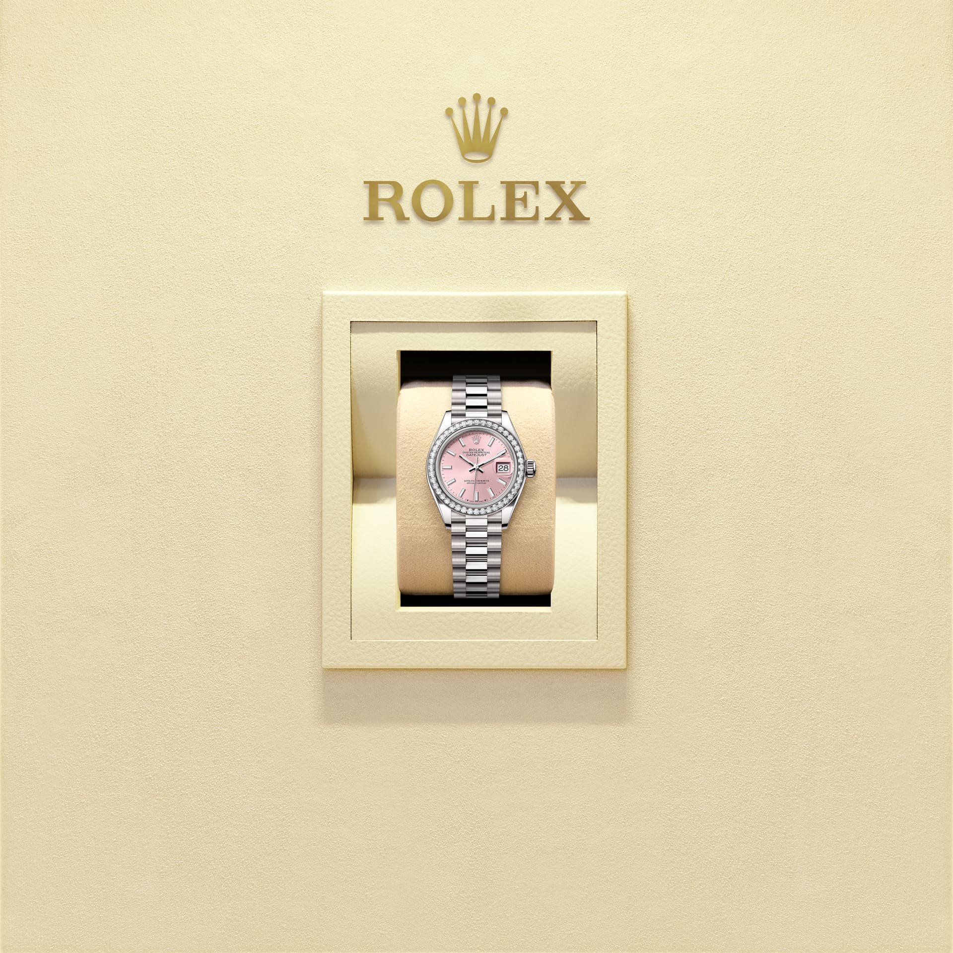 Oyster Perpetual Lady-Datejust腕錶18K白色黃金款,搭配粉紅色錶面及元首型(President)錶帶。