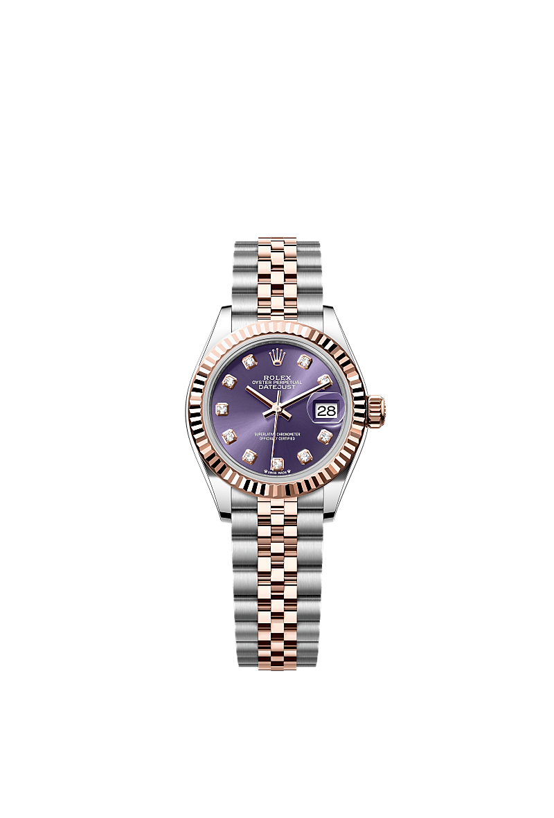 Oyster Perpetual Lady-Datejust腕錶永恒玫瑰金及蠔式鋼款,搭配鑲鑽茄紫色錶面及紀念型(Jubilee)錶帶。