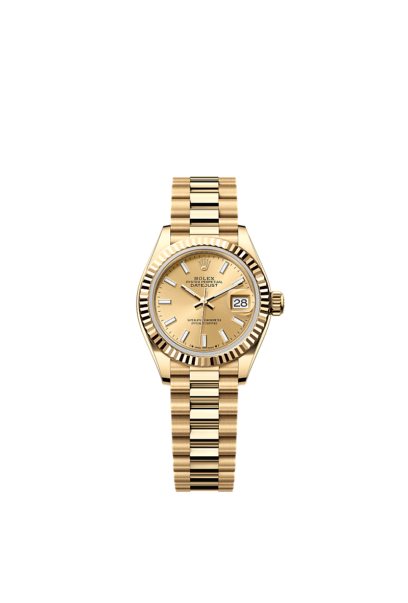 Oyster Perpetual Lady-Datejust腕錶18K黃金款,搭配香檳色錶面及元首型(President)錶帶。