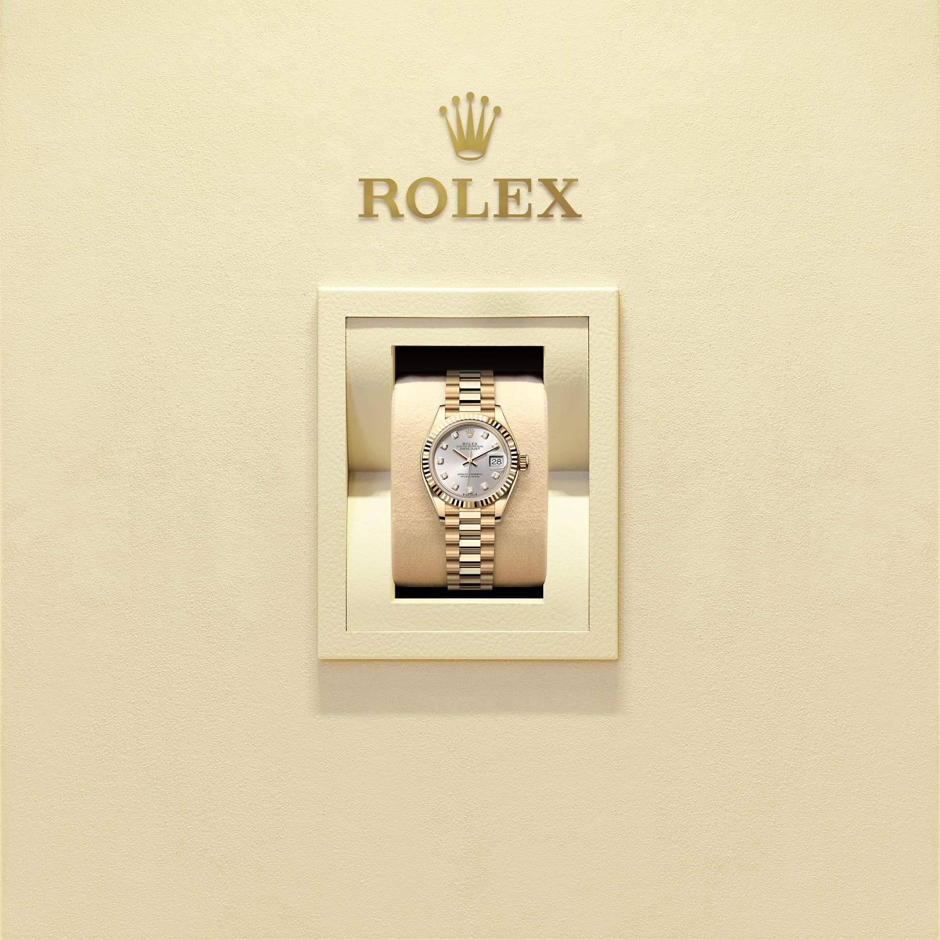 而底蓋上可見的坑紋設計亦出於同樣目的,並以特定的勞力士工具旋緊於錶殼。及後,三角坑紋演變為一項美學設計元素,堪為勞力士的經典特色。時至今日,三角坑紋成為品牌腕錶的特色,這款Lady-Datejust的外圈以金製成。