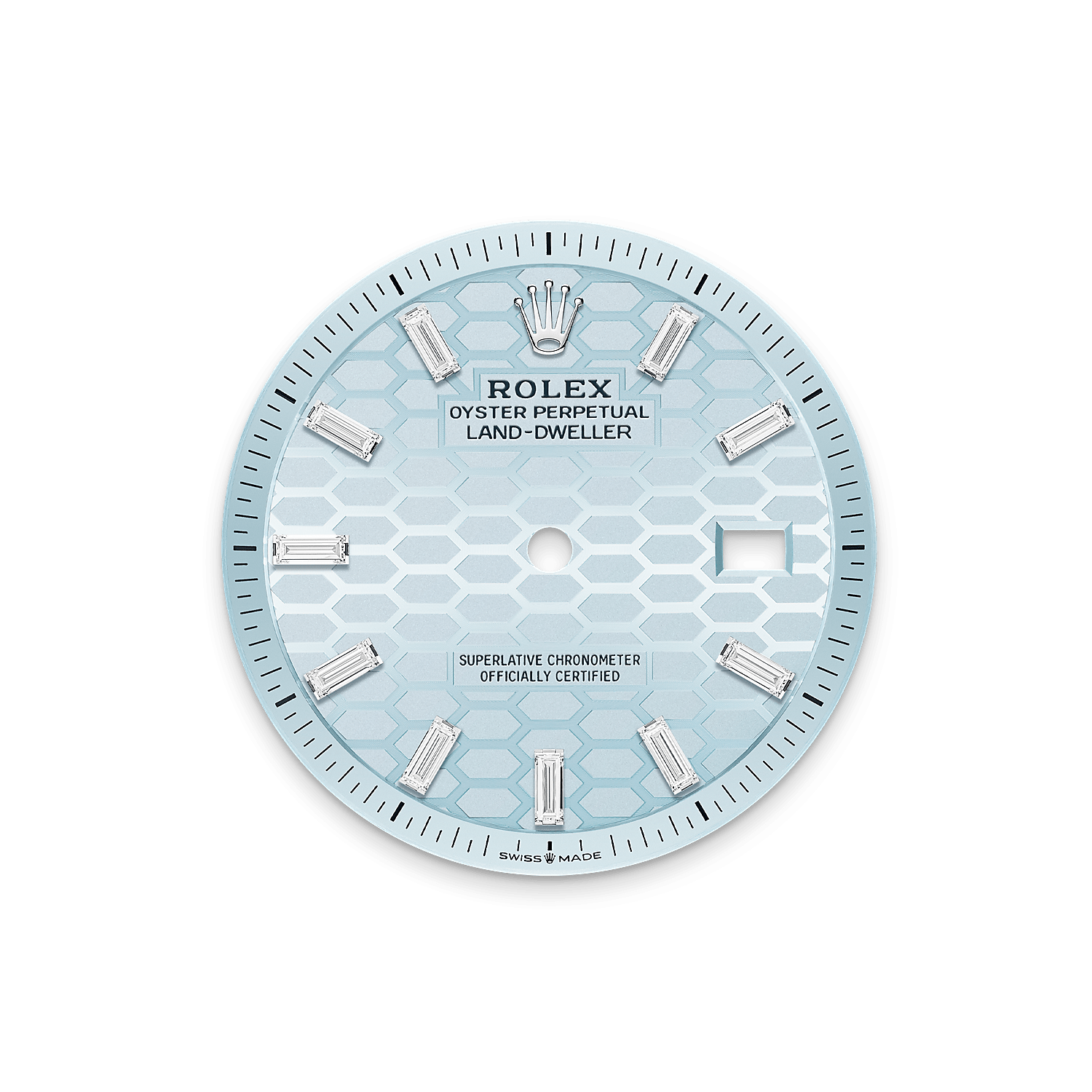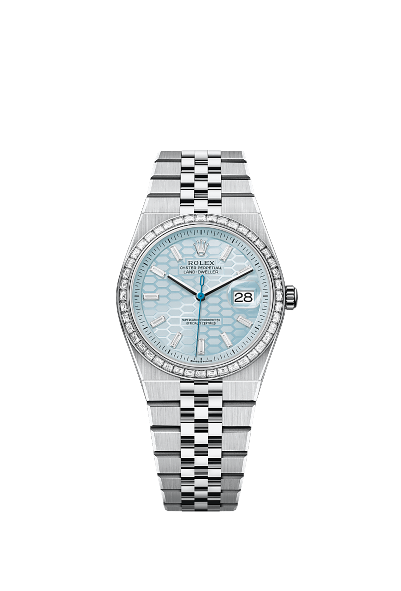 Land-Dweller 36腕錶鉑金款,搭配冰藍色蜂巢圖案鑲鑽錶面及纖薄紀念型(Flat Jubilee)錶帶。