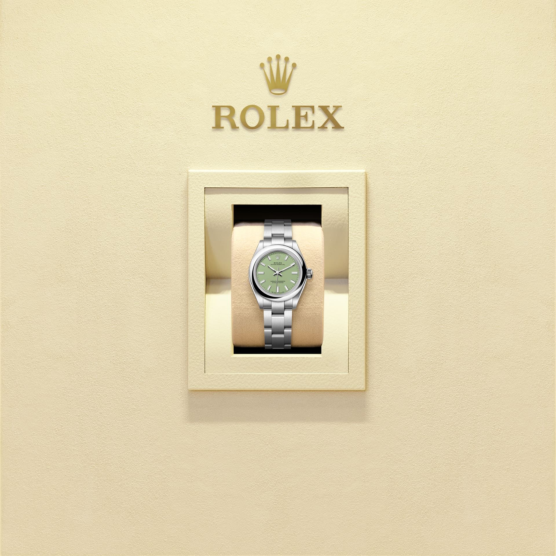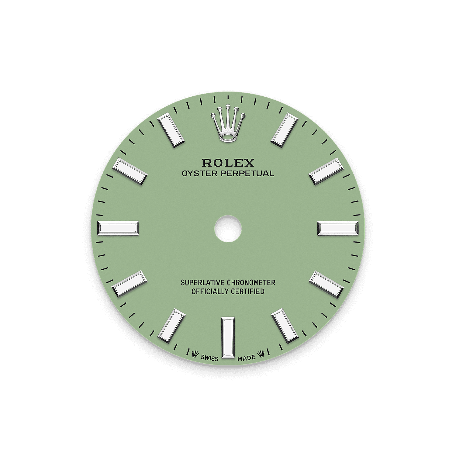 Oyster Perpetual 28腕錶搭配開心果綠色錶面及蠔式(Oyster)錶帶。